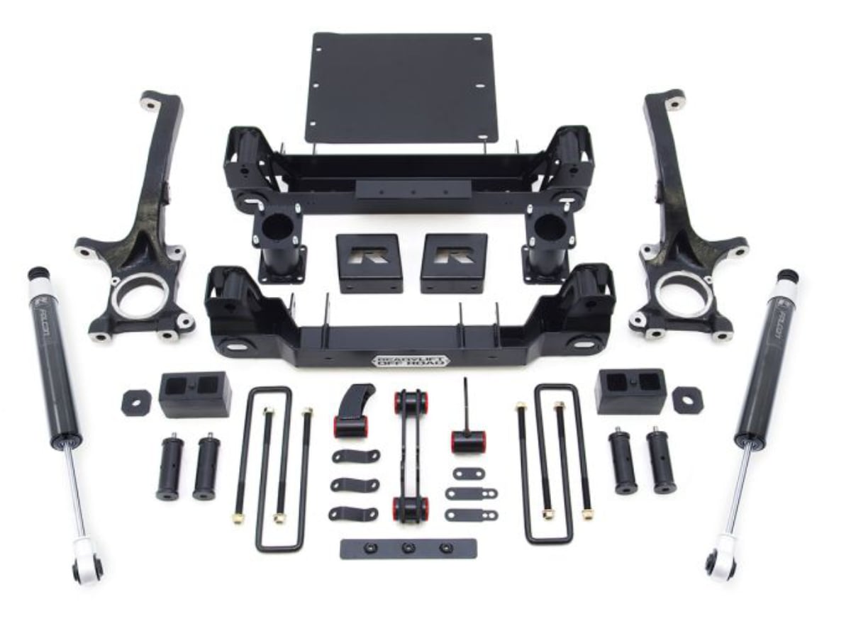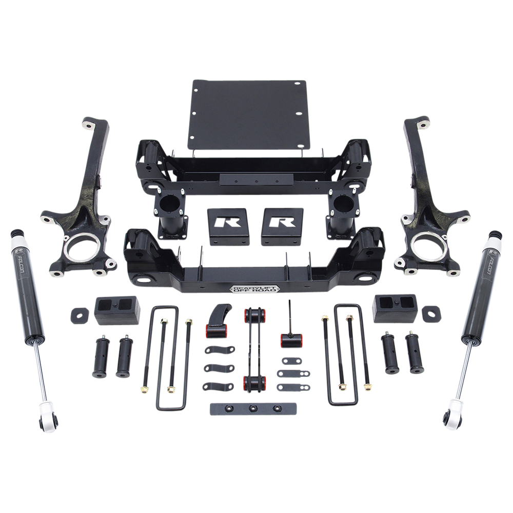 The 44-56770 6” lift kit for Tundra trucks are packed with great standard features! Starting with our ultra-strong laser cut, CNC bent, welded and boxed sub-frame drop assemblies that keep the suspension geometry where it is supposed to be and increases available ground clearance! Our proprietary, precision-designed iron front knuckles feature CNC-machining to guarantee fit while retaining the factory tie rods with minor trimming required. The new ReadyLIFT Tundra front lift is achieved using the time-tested offset spacer design. These strong steel spacers attach to the factory strut - resulting in a factory ride - while positioning the suspension in such a way as to not increase track width. What does that mean? It means the front tires won't still out further than the rear tires like most other kits. It means owners can run stock 20" wheels and use the factory spare tire if needed (restrictions apply). The ReadyLIFT sub-assembly design features a truly innovative approach to dropping the differential. The differential drop system is engineered for easy installation and correctly positions the differential to maintain CV axle and driveline angles. With the 44-56770 lift kits customers can rest assured they will not be prematurely wearing out tires. The ReadyLIFT system is built around maintaining proper alignment and geometry specifications. For the rear, this kit includes the time-tested OEM-style cast iron rear lift blocks and longer U-bolts with hardware. Additionally, ReadyLIFT also includes thoughtful accessories such as new bump stop extensions all the way around as well as sway bar frame mount brackets to keep the front sway bar in a factory geometry. All of this contributes to an excellent driving and handling suspension system that truly enhances the typical Toyota Tundra truck!