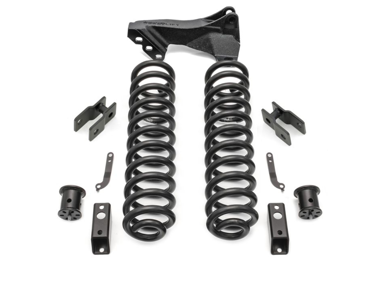 ReadyLIFT Suspension offers a 2.5" Lift Coil Spring Front Leveling Kit engineered exclusively to fit 2020-2022 MY Ford Super Duty F250/F350/F450 4WD diesel trucks. The 46-20252 is designed for those who wish to retain the factory shock performance which also includes our track bar relocation bracket. A front coil spring leveling kit is a superior alternative for lifting the front of your truck. The coil spring system allows for increased tire sizes and widths along with providing improved ground clearance and a more commanding view of the road. The coil spring leveling kit delivers a great ride and handling performance and allows for 35” tall tires! This combination is more than just a leveling kit. This is a performance and ride-enhancing kit. ReadyLIFT is confident you will be amazed at how well it rides and performs both on and off-road. The ReadyLIFT 2.5" Coil Spring Front leveling kit system for 2020-2022 Ford Super Duty F250/F350/F450 trucks also included model-specific brake line extension brackets, our time-tested bump stop extension brackets, and new front sway bar frame mount extension brackets to keep the factory sway bar where is supposed to be. If you want a rugged, leveled stance and a smooth but controlled ride, then you want the new Coil Spring Leveling Kit System. Your truck will thank you! NOTE: Not recommended for TREMOR editions.