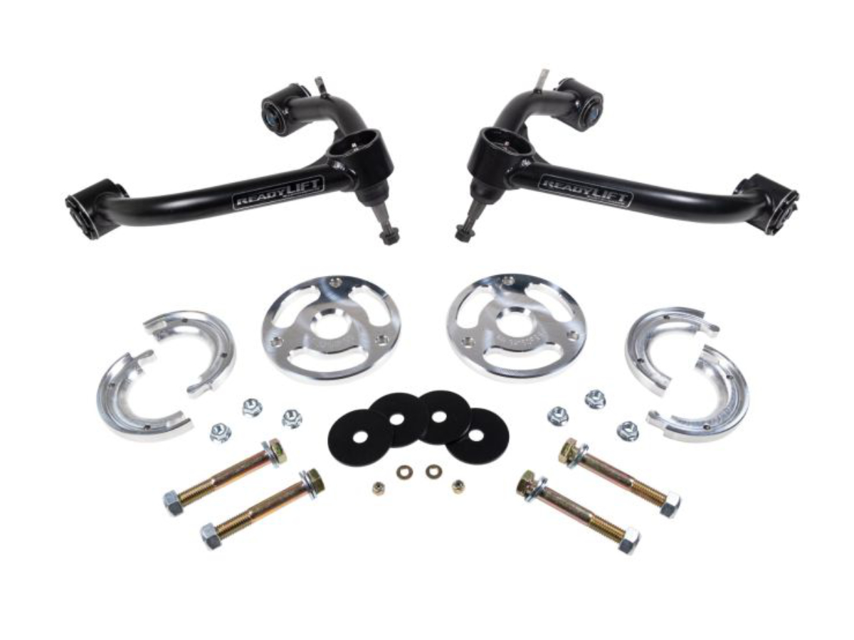The leveling kit provides the required amount of level lift without causing compromises to the factory strut geometry and clearances with our new interlocking pre-load spacer for ease of installation. Considering the factory upper control arm's limited dynamic range when the AT4X/ZR2 truck is further lifted, this leveling kit includes our popular tubular upper control arms with corrected ball joint cup angles, heavy-duty replaceable ball joints, and our new Terrain Control Technology (TCT) maintenance-free pivot bushings with side-biter washers to improve alignment retention.