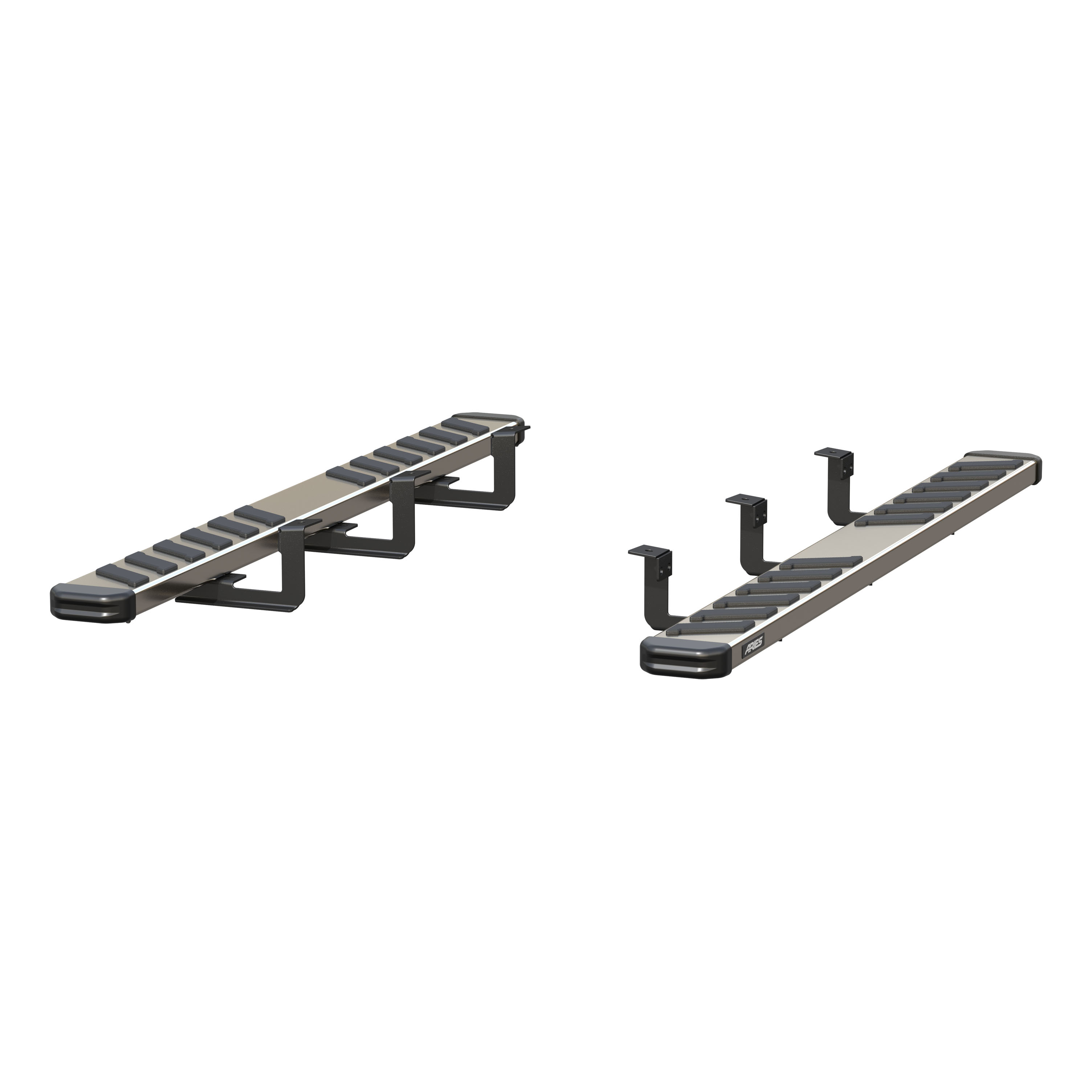 Upgrade your vehicle with the perfect balance of bold style and everyday functionality. The ARIES® NovaTrac™ Running Boards are engineered to offer a sleek, OE-inspired look while delivering superior strength and safety for every journey. With their 6" wide, streamlined profile, NovaTrac™ running boards offer safe footing without sacrificing style. Each running board is reinforced with extra-wide, non-skid step pads, designed to provide secure traction no matter the weather. Built from rigid steel with a carbide black powder coat finish, NovaTrac™ running boards combine lasting shine with exceptional rust and corrosion resistance, ensuring years of dependable use. Durable TPO plastic end caps add a refined finishing touch, while enhancing resilience against wear and tear. Whether you're upgrading for function or style, NovaTrac™ running boards offer an easy, custom solution for your vehicle. VersaTrac™ mounting brackets sold separately.