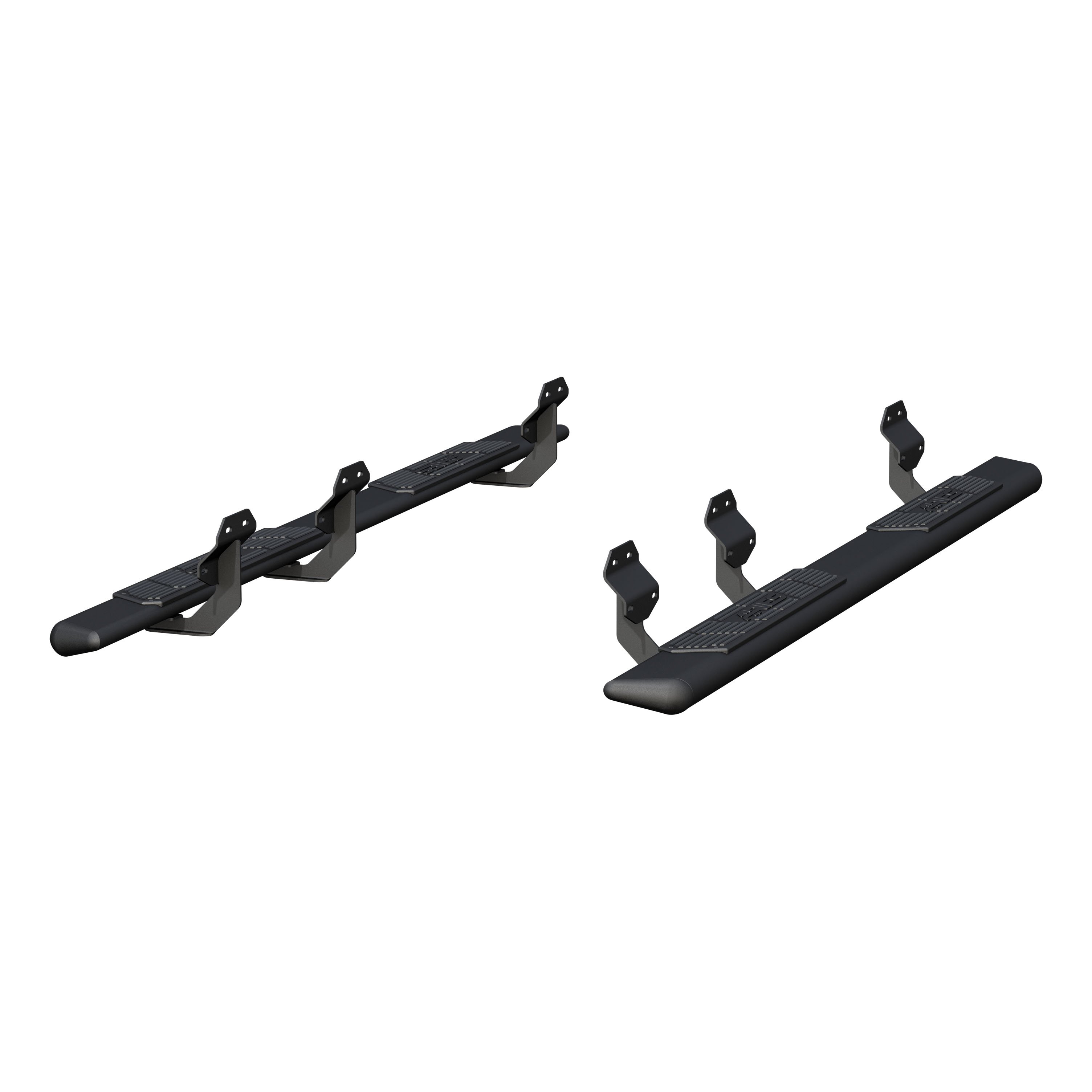 Modern trucks and SUVs are as much about power as they are style. Don't settle for second-rate side steps on your shiny new ride. Give your truck the elegant style, modern functionality and long-lasting durability it deserves with ARIES AscentStep® running boards. These running boards are engineered with a sleek teardrop shape, unique dual-constructed step pads, a strong and corrosion-resistant build and a no-drill custom fit. AscentSteps® are truly designed to be running for the modern truck. They feature a unique teardrop-shaped tube profile that sets them apart from similar oval side steps. The boards measure 5-1/2® wide and have rounded, blended end caps for a seamless, eye-catching accent on the truck. The step pads of these truck running boards are also highly unique, not only adding to the distinguished style but also providing reliable safety when entering or exiting the vehicle. The step pads are a two-part construction, consisting of a polyethylene tread and a metal overlay. The poly tread protrudes through the overlay, providing an unmistakable look and dependable non-skid traction. The treads are also angled, adding a sleek look to the boards. The stainless steel overlay provides a protective barrier for the steel boards underneath, easily resisting corrosion despite scuffs, scratches and marring from frequent foot traffic. AscentStep® running boards are built for rigidity and long-lasting weather resistance. They are constructed from high-strength steel to give you a solid step up. To protect the running boards from rain, dirt, snow and the other elements, they are covered in a highly durable carbide black powder coat finish. The powder coat keeps the boards resilient to rust and corrosion, and it is also scratch- and scuff-resistant to maintain a clean finish. To ensure that ARIES AscentStep® running boards are truly a modern solution for your vehicle, each set is designed for vehicle-specific installation. This means that the brackets, the board length and the position of the step pads are all customized to precisely match each year, make and model. This particular set of custom running boards is designed to fit select years of the Toyota Tundra crew cab (see application information to verify compatibility with your year, make, model and style). AscentStep® running boards are equipped with the VersaTrac® installation system. VersaTrac® uses vehicle-specific brackets to mount onto the truck without any drilling or tedious modifications required. Additionally, VersaTrac® brackets are compatible with multiple running boards and side steps. With the brackets installed, any running board with the VersaTrac® system can be mounted on the vehicle with ease. You can customize the look of your vehicle and easily change the look any time.
