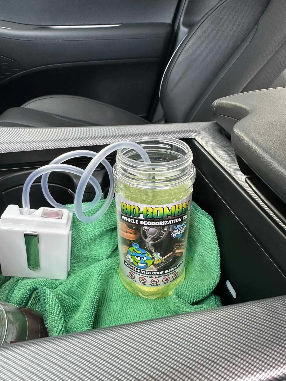 Fill the Bio-Bombs application jar with water to the designated fill line and place it in the vehicle’s cupholder.