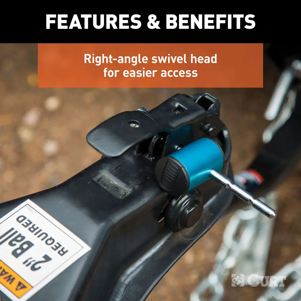 This coupler lock features a right-angle barbell design to keep the pin well protected from tampering. It comes with a chrome finish with blue anodized aluminum and offers an adjustable pin span from 1" to 3" with a pin diameter of 1/4". All CURT coupler locks are made to fit latch-type couplers and include two keys. Protect your boat, your camper and even your utility trailer the right way with a CURT coupler lock.