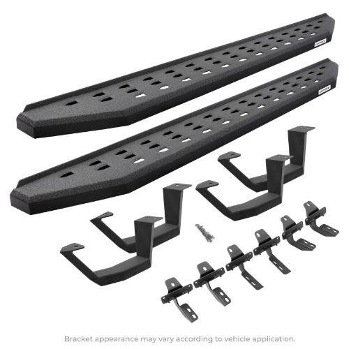 Go Rhino's legendary RB20 cab length running boards will make your truck, Jeep or SUV stand apart from the crowd. With an aggressive, yet stylish appearance, these bolt-on steps take their visual inspiration from the Ford Raptor but are made for more than just looks. The RB20's perforated holes, punched into the surface of the step, gives maximum traction and prevents mud, ice, and snow from accumulating. The corrosion-resistant 16-gauge steel steps are mounted high and tight, giving them plenty of clearance for off-roading, and are strong enough to support hundreds of pounds. The RB20 is offered in textured black powder coat or bedliner coating. Matching drop steps will make entering and exiting lifted vehicles even easier. Hardware and brackets are included. RB20 Running Boards With Drop Steps come with a Limited Lifetime warranty on materials and construction and a 5 year warranty on the the Textured Black Finish.
