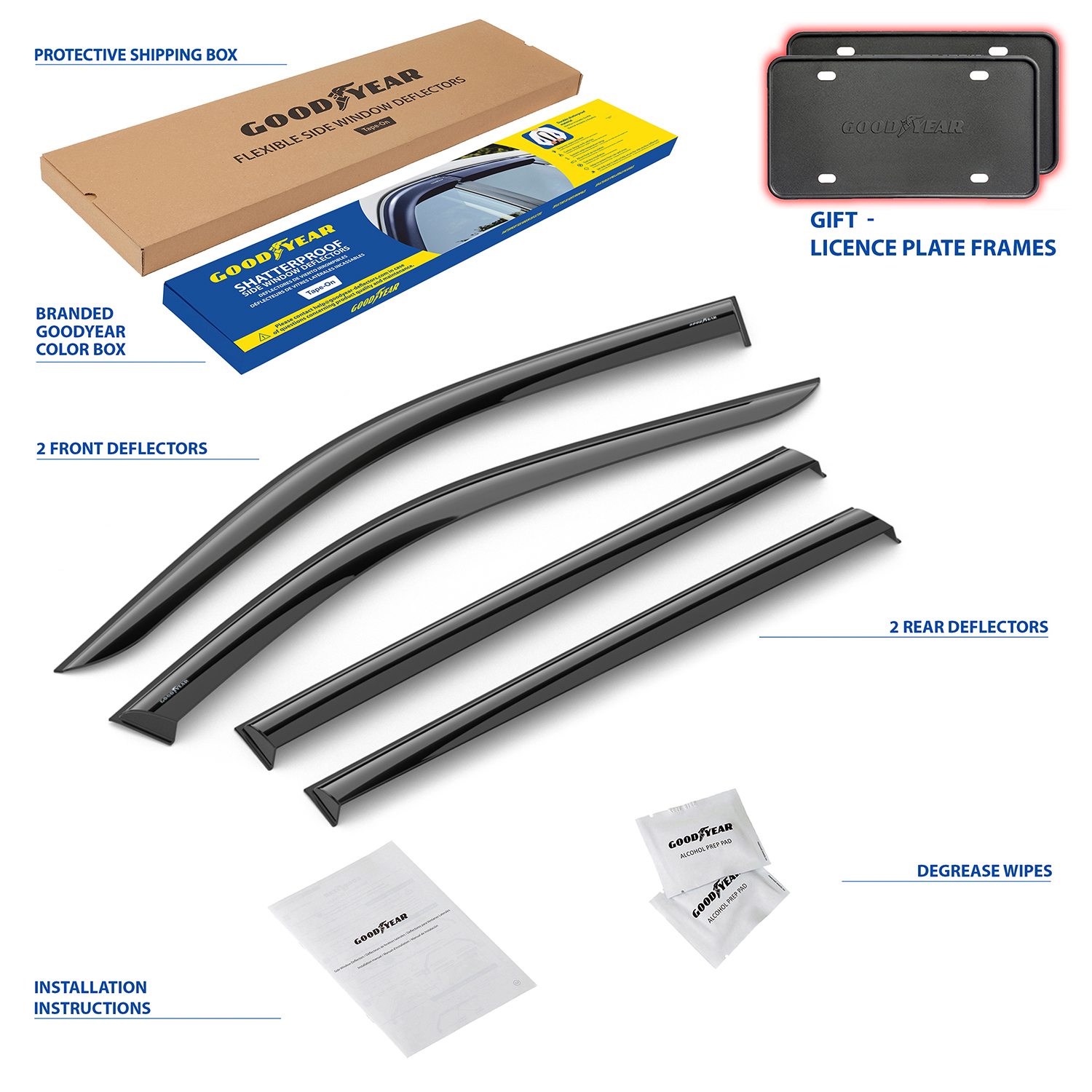 Goodyear Shatterproof Side Window Deflectors the famous high quality rain guards that let you drive with your window down in rain, snow, ice and other inclement conditions. These rain guards are made of special, extra durable, flexible polycarbonate. You can be sure that our deflectors will not break during installation or use Each deflector is designed by a group of engineers to fit the exact car model.