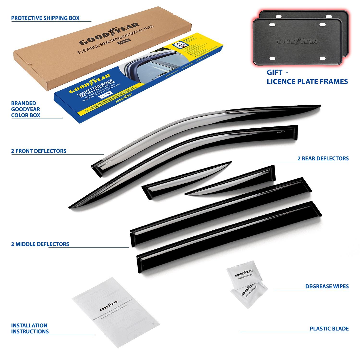 Goodyear Shatterproof Side Window Deflectors the famous high quality rain guards that let you drive with your window down in rain, snow, ice and other inclement conditions. These rain guards are made of special, extra durable, flexible polycarbonate. You can be sure that our deflectors will not break during installation or use Each deflector is designed by a group of engineers to fit the exact car model.