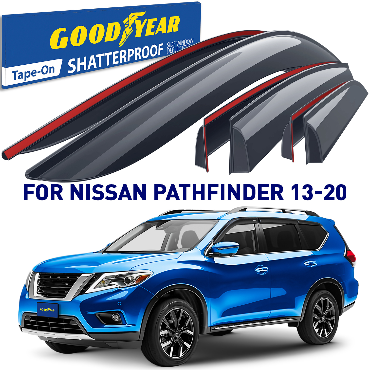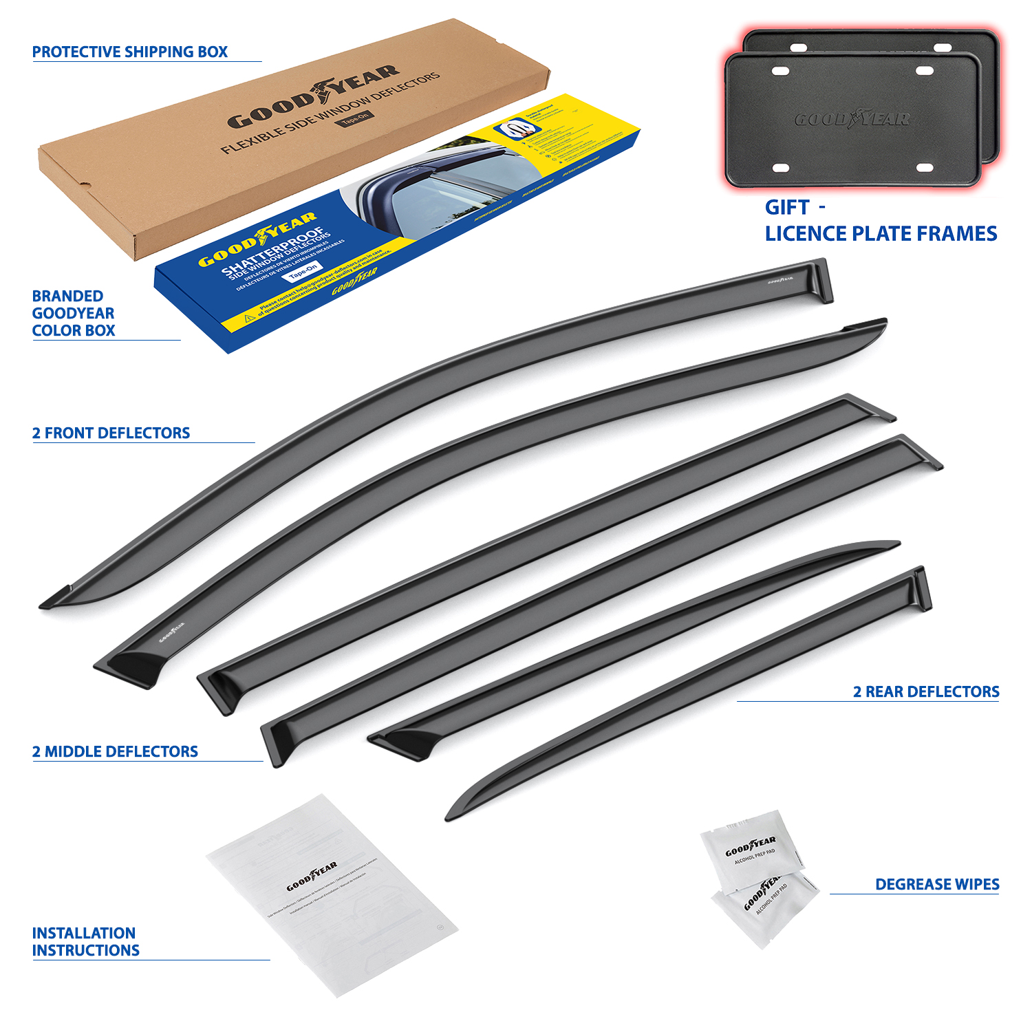 Goodyear Shatterproof Side Window Deflectors the famous high quality rain guards that let you drive with your window down in rain, snow, ice and other inclement conditions. These rain guards are made of special, extra durable, flexible polycarbonate. You can be sure that our deflectors will not break during installation or use Each deflector is designed by a group of engineers to fit the exact car model.