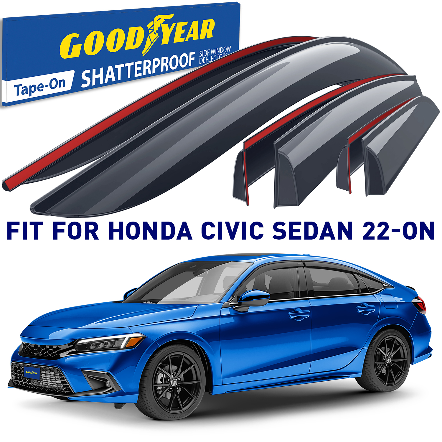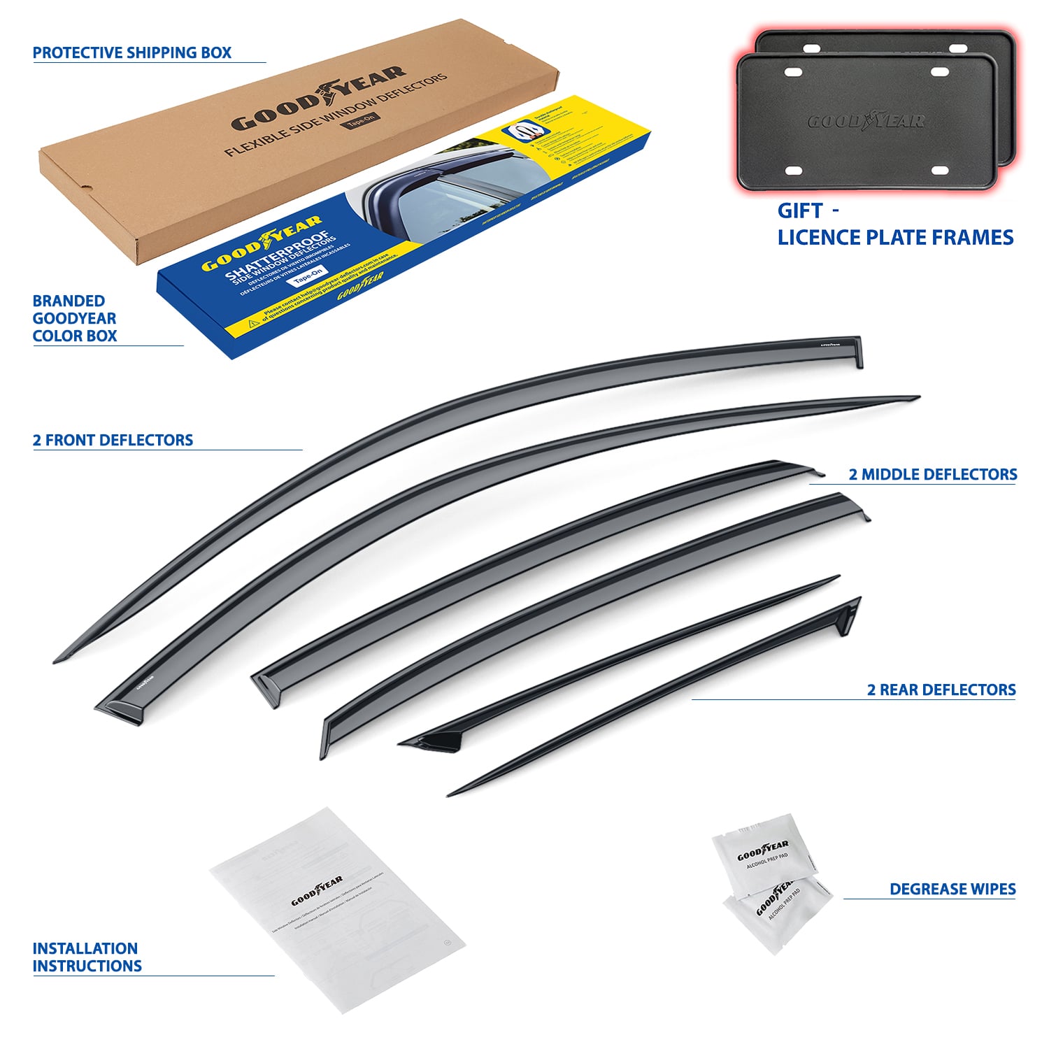 Goodyear Shatterproof Side Window Deflectors the famous high quality rain guards that let you drive with your window down in rain, snow, ice and other inclement conditions. These rain guards are made of special, extra durable, flexible polycarbonate. You can be sure that our deflectors will not break during installation or use Each deflector is designed by a group of engineers to fit the exact car model.