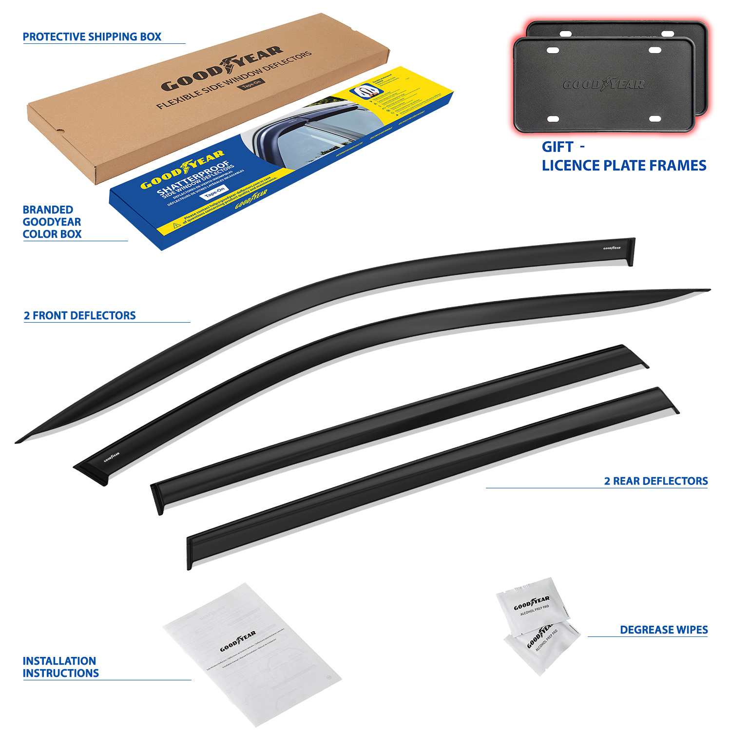 Goodyear Shatterproof Side Window Deflectors the famous high quality rain guards that let you drive with your window down in rain, snow, ice and other inclement conditions. These rain guards are made of special, extra durable, flexible polycarbonate. You can be sure that our deflectors will not break during installation or use Each deflector is designed by a group of engineers to fit the exact car model.