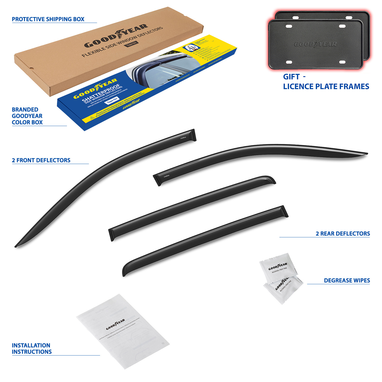 Goodyear Shatterproof Side Window Deflectors the famous high quality rain guards that let you drive with your window down in rain, snow, ice and other inclement conditions. These rain guards are made of special, extra durable, flexible polycarbonate. You can be sure that our deflectors will not break during installation or use Each deflector is designed by a group of engineers to fit the exact car model.