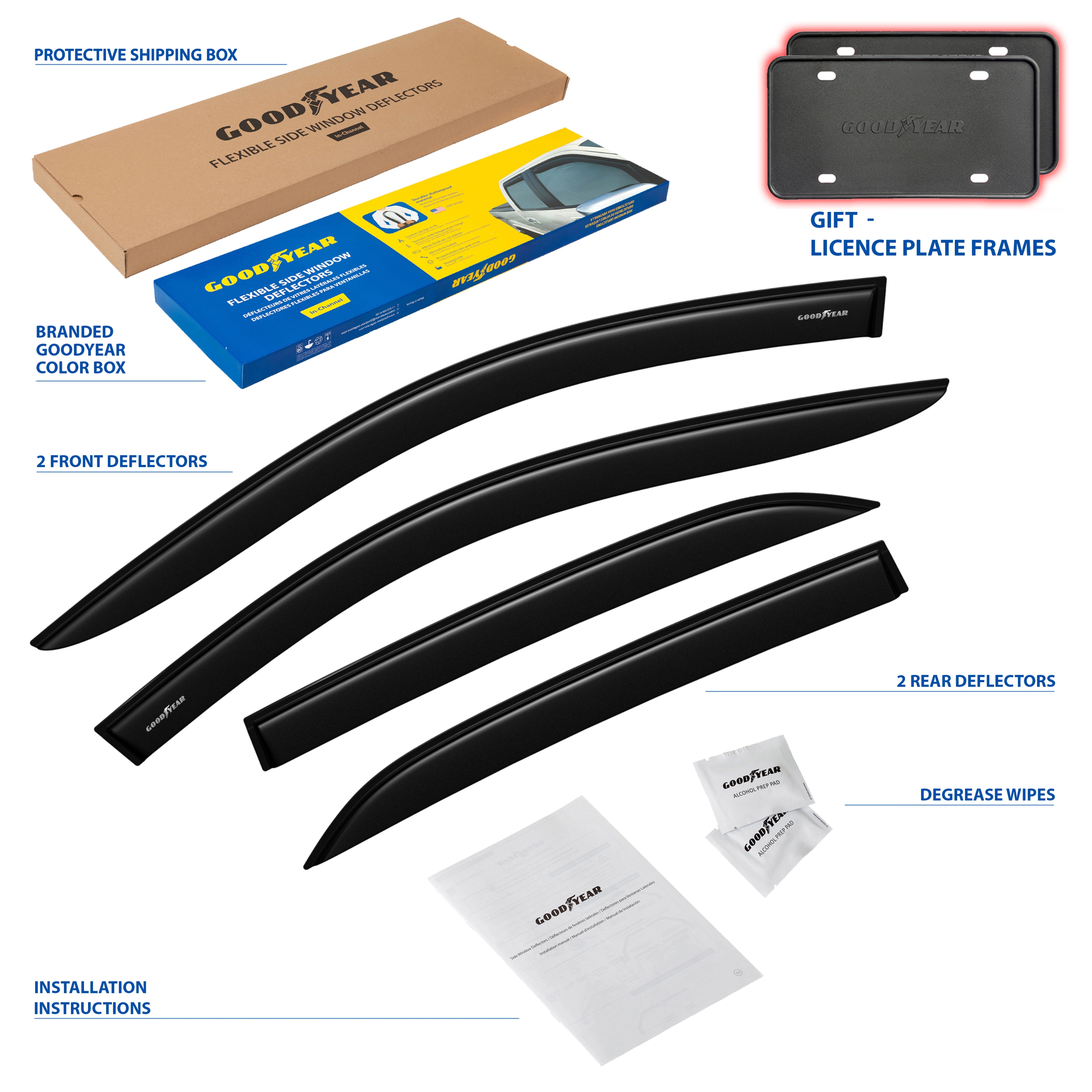 Goodyear Shatterproof Side Window Deflectors the famous high quality rain guards that let you drive with your window down in rain, snow, ice and other inclement conditions. These rain guards are made of special, extra durable, flexible polycarbonate. You can be sure that our deflectors will not break during installation or use Each deflector is designed by a group of engineers to fit the exact car model.