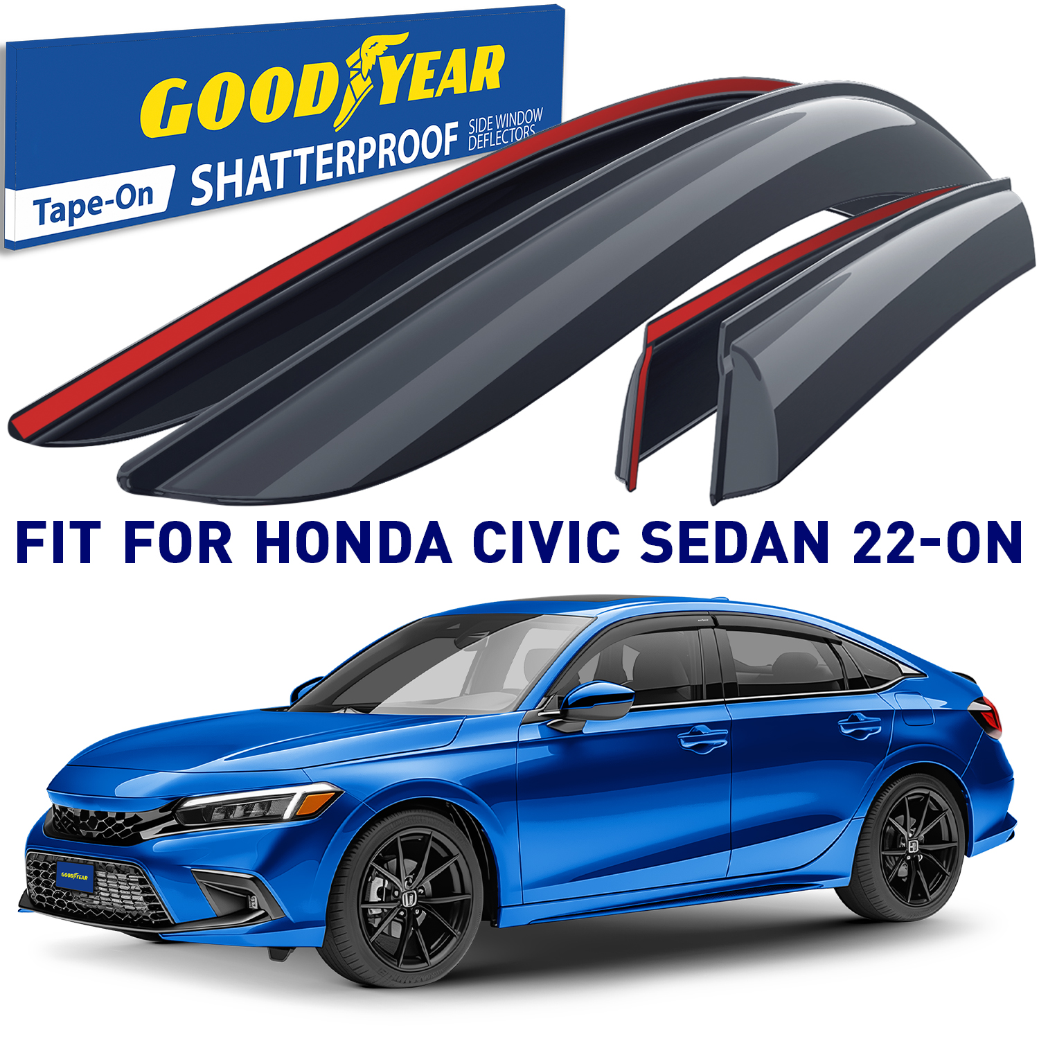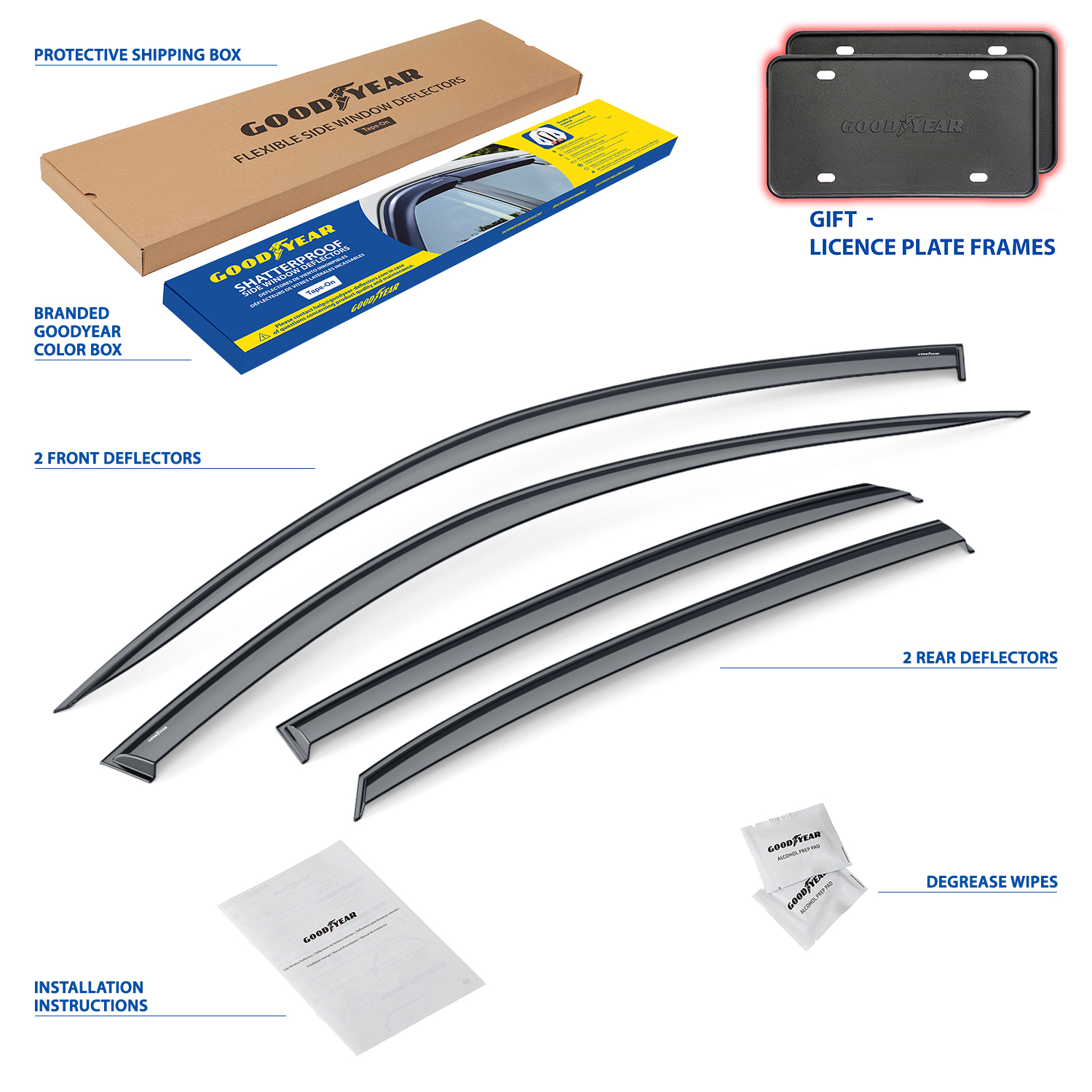 Goodyear Shatterproof Side Window Deflectors the famous high quality rain guards that let you drive with your window down in rain, snow, ice and other inclement conditions. These rain guards are made of special, extra durable, flexible polycarbonate. You can be sure that our deflectors will not break during installation or use Each deflector is designed by a group of engineers to fit the exact car model.