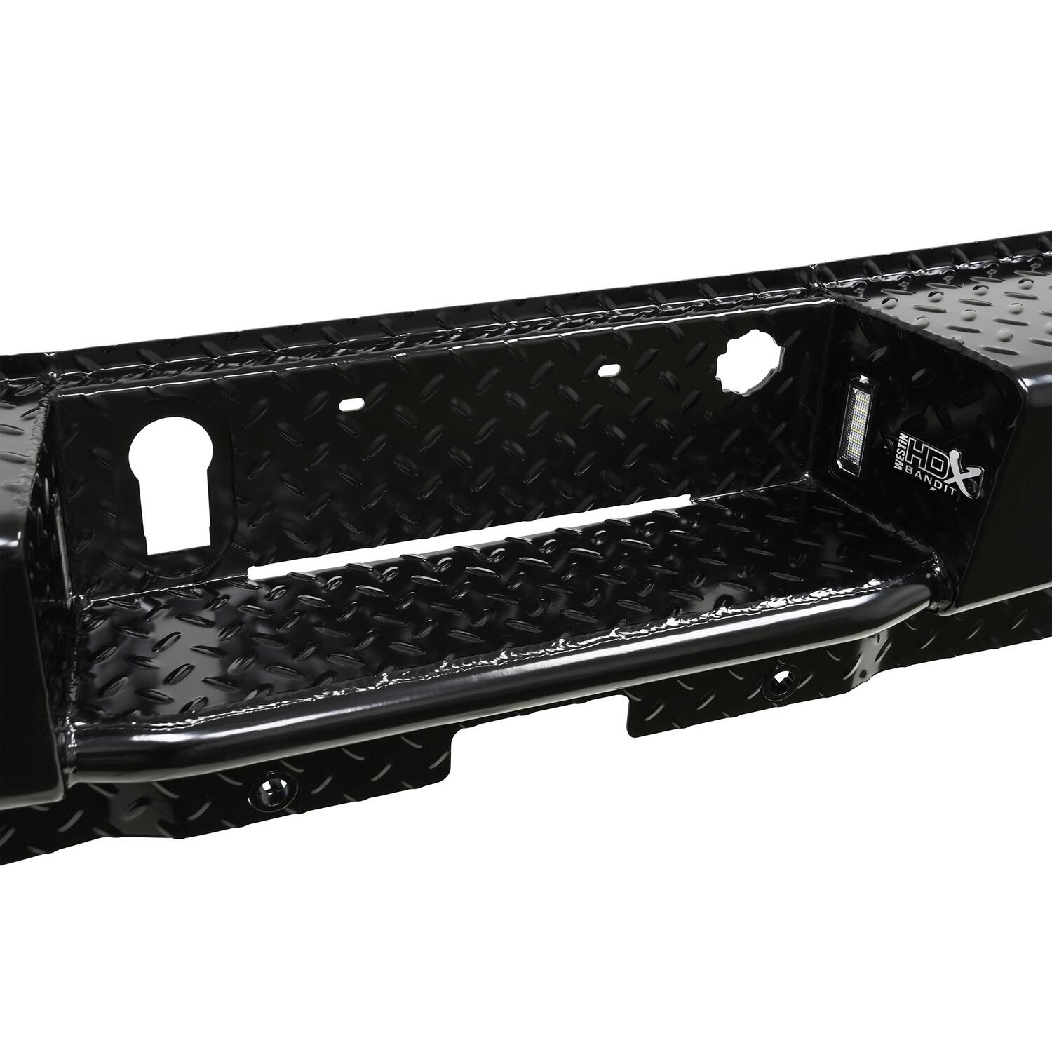 “Stand out from the Competition” with the all new HDX Bandit Rear Bumper from Westin. Built to compliment the style, precision, and durability of the matching HDX Bandit Front Bumper, this all new “off-road style” rear bumper, is clearly a cut above. Unlike the competition, which features an overlapping two piece design and an ugly weld which can warp the metal and is prone to rust, the new HDX Bandit Rear Bumper features an extremely clean, one piece design. The stamped diamond plate step surface is constructed of 11 gauge plate steel and features a welded inner structure for maximum strength. A unique “corner step” design provides extra wide step area to allow easy access to bed and cargo area. HDX Bandit Rear Bumper includes hardware, mounting brackets, flush mount LED license plate lights and two standard LED back up lights. Fully compatible with blind spot monitors and parking sensors, and can also accommodate an OEM hitch. HDX Bandit Rear is designed for heavy duty performance and extended life that is backed by a 3 year warranty with a black powder coat finish. The new HDX Bandit Rear Bumper is truly in a class by itself.