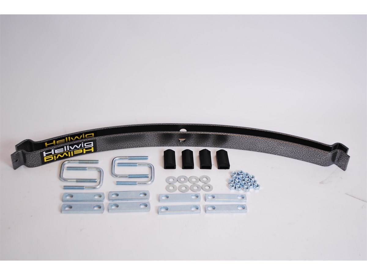 Hellwig's medium-duty EZ-1000 Helper Springs pack a lot of capability in every box. Packaged complete with the same heavy duty powder coated and plated components, hardware and installation instructions as our heavy duty helper spring products, these kits are designed for the vehicles that need lighter assistance in carrying a load. The simple bolt on design using common hand tools provide the installer ease of installation and the vehicle owner hassle free use. Ideally suited for light towing and loads, these units are fully adjustable using the heavy duty U-bolts included in the kit using simple hand tools. If your tow and haul needs change, simply adjust the U-bolts to suit the new load requirements. Once installed and adjusted you are free to haul or tow with greater control and stability. Manufactured with heat treated ASTM 5160 alloy spring steel in our California based facility, these units are rated up to 1,000 lb. level load carrying capacity. They are a great cost effective spring solution and can be adjusted independently for uneven side to side loads.