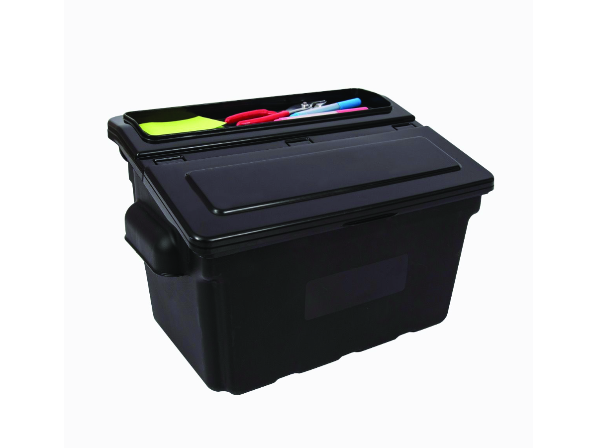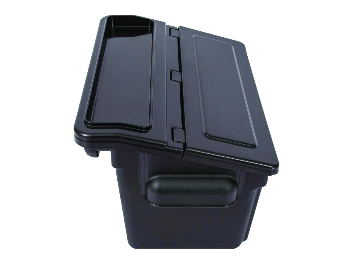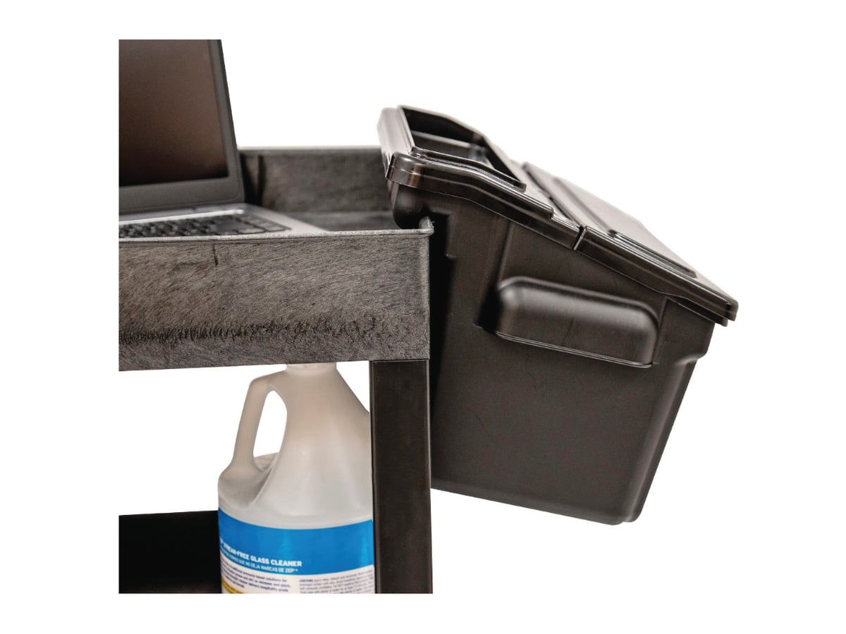 Perfect for bottles, tools, hardware, restaurant and hotel supplies, and much more, the Outrigger simply slides over the lip of your cart’s tub-style shelf. Features of these service cart bins include a 25 lb. weight capacity, a hinged, snap-on lid with integrated tool tray, plus molded-in grab handles for easy carrying. Sturdy polypropylene construction with an easy to clean surface ensures years of reliable use and superior resistance to damage from hard impacts.
