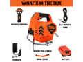 Portable Electric Winch – 1000 lb. Load CapacityThe RHINO PULL 1000™ will give you the power to pull items anywhere you need it, including the garage, workshop, or the farm. This portable winch can even go with you if you are hunting. This ergonomically designed tool features 39’ of synthetic rope, a variable speed hand controller, a wireless control that can work up to 50’, and a corded remote if the wireless remote battery is not maintained.