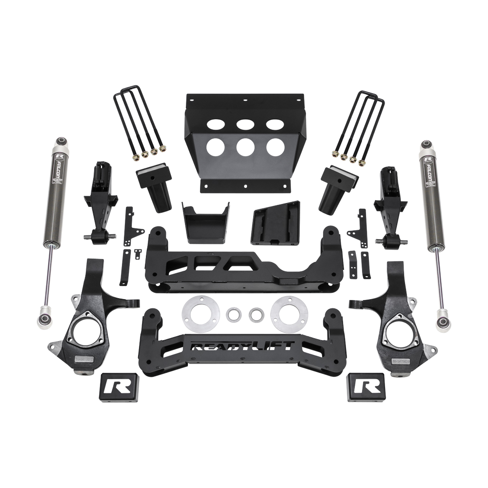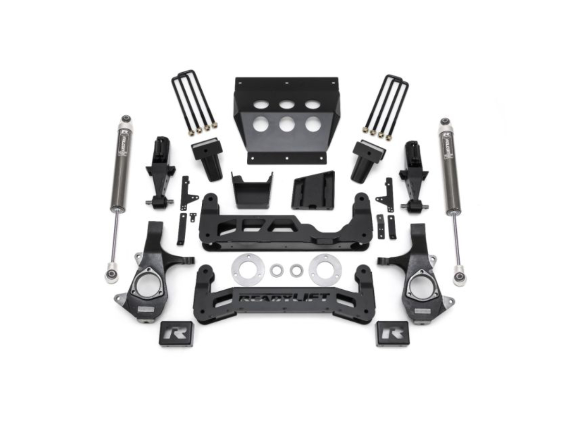 ReadyLIFT is excited to now offer a brand new 7-inch big lift kit for 2014-2016.5 Chevy Silverado and GMC Sierra 1500 trucks. This new lift system with Falcon 1.1 Monotube Shocks will work with trucks equipped with or without MagneRide. The new 44-34700 7 inch lift kit is designed for use on 2014-2016.5 GM 1500 trucks equipped with the factory Aluminum front suspension. Some of the great features our new 7 inch lift kit includes retaining the factory turning radius while minimizing track width increase to less than 0.5" per side. This kit will allow for up to a 35" tall tire on a 9 inch wide wheel with -12 offset. Our new "clam-shell" style lower strut extension retains use of the factory struts (both standard and front-only MagneRide) and does not require strut rotation. These new clam-shell brackets utilizes our TCT lower bushings to provide a precise pivot point that maintains the factory ride. Boxed steel front/rear cross members and full width front skid plate are constructed of thick 3/16" plate steel while also allowing for use of the OE front plastic gravel guard to protect the engine bay and retain the proper air flow as intended by the GM designers. New 1/4-inch boxed plate steel differential drop brackets feature a double gusset and boxed center rib to take the abuse of front differential torsional twisting. (Not for use on AWD applications - 2WD or 4WD only). Rear lift is achieved with fabricated 3/16-inch thick plate steel rear lift blocks that include built-in bump stop landings and an offset pin design to properly center the axle and specific angles to the blocks to retain the proper pinion angle. This new lift system includes premium extended length Falcon 1.1 Monotube rear shocks.
