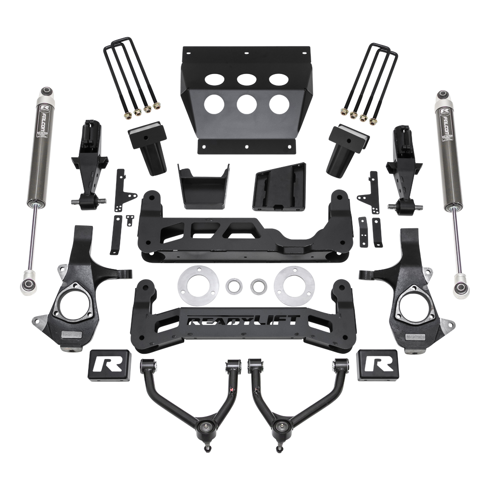 ReadyLIFT is excited to now offer a brand new 7-inch big lift kit for 2014-2018 Chevy Silverado and GMC Sierra 1500 trucks. This new lift system will work with trucks equipped with or without MagneRide. The new 44-34720 7 inch lift kit is designed for use on 2014-2018 GM 1500 trucks equipped with the factory Stamped Steel front suspension and includes new tubular upper control arms. Some of the great features our new 7 inch lift kit includes retaining the factory turning radius while minimizing track width increase to less than 0.5" per side. This kit will allow for up to a 35" tall tire on a 9 inch wide wheel with -12 offset. Our new "clam-shell" style lower strut extension retains use of the factory struts (both standard and MagneRide) and does not require strut rotation. These new clam-shell brackets utilizes our TCT lower bushings to provide a precise pivot point that maintains the factory ride. The addition of our proprietary new tubular upper control arms with TCT pivot bushings.ensures prolonged upper control arm strength which is far superior to the OE stamped steel control arms. Boxed steel front/rear cross members and full width front skid plate are constructed of thick 3/16" plate steel while also allowing for use of the OE front plastic gravel guard to protect the engine bay and retain the proper air flow as intended by the GM designers. New 1/4-inch boxed plate steel differential drop brackets feature a double gusset and boxed center rib to take the abuse of front differential torsional twisting. (Not for use on AWD applications - 2WD or 4WD only). Rear lift is achieved with fabricated 3/16-inch thick plate steel rear lift blocks that include built-in bump stop landings and an offset pin design to properly center the axle and specific angles to the blocks to retain the proper pinion angle. This new lift system includes premium extended length Falcon 1.1 Monotube rear shocks. Notes: Fits up to a 35 tall off road tire - requires a 9 inch wide wheel with -12 offset for no rub (tire tread varies - some aggressive tires may require minor trimming. Not for use on AWD applications Not recommended for GMC Denali 1500 with REAR MagneRide or other models with Rear MagneRide. Front MagneRide okay. Can be used on trucks with factory Aluminum front suspension Includes ReadyLIFT ReadyGuard Powertrain Warranty