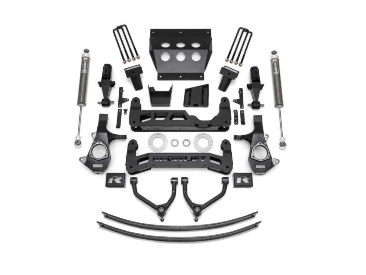 ReadyLIFT is excited to now offer a brand new 9-inch big lift kit for 2014-2018 Chevy Silverado and GMC Sierra 1500 trucks. This new lift system will work with trucks equipped with or without front MagneRide. The new 44-34900 9 inch lift kit is designed for use on 2014-2018 GM 1500 trucks equipped with the factory Aluminum or Stamped Steel front suspension and includes new tubular upper control arms. Some of the great features our new 9 inch lift kit includes retaining the factory turning radius while minimizing track width increase to less than 0.5" per side. This kit will allow for up to a 37" tall tire on a 9 inch wide wheel with -12 offset. Our new "clam-shell" style lower strut extension retains use of the factory struts (both standard and front-only MagneRide) and does not require strut rotation. These new clam-shell brackets utilizes our TCT lower bushings to provide a precise pivot point that maintains the factory ride. The addition of our proprietary new tubular upper control arms with TCT pivot bushings.ensures prolonged upper control arm strength which is far superior to the OE stamped steel control arms. Boxed steel front/rear cross members and full width front skid plate are constructed of thick 3/16" plate steel while also allowing for use of the OE front plastic gravel guard to protect the engine bay and retain the proper air flow as intended by the GM designers. New 1/4-inch boxed plate steel differential drop brackets feature a double gusset and boxed center rib to take the abuse of front differential torsional twisting. (Not for use on AWD applications - 2WD or 4WD only). Rear lift is achieved with are rear add-a-leaf spring and fabricated 3/16-inch thick plate steel rear lift blocks that include built-in bump stop landings and an offset pin design to properly center the axle and specific angles to the blocks to retain the proper pinion angle. This new lift system includes premium extended length Falcon 1.1 Monotube rear shocks. Notes: Fits up to a 37 tall off road tire - requires a 9 inch wide wheel with -12 offset for no rub (tire tread varies - some aggressive tires may require minor trimming. Not for use on AWD applications. Not recommended for GMC Denali 1500 with REAR MagneRide or other models with Rear MagneRide. Only Front MagneRide compatible. Can be used on trucks with factory Aluminum front suspension. Includes ReadyLIFT ReadyGuard Powertrain Warranty.