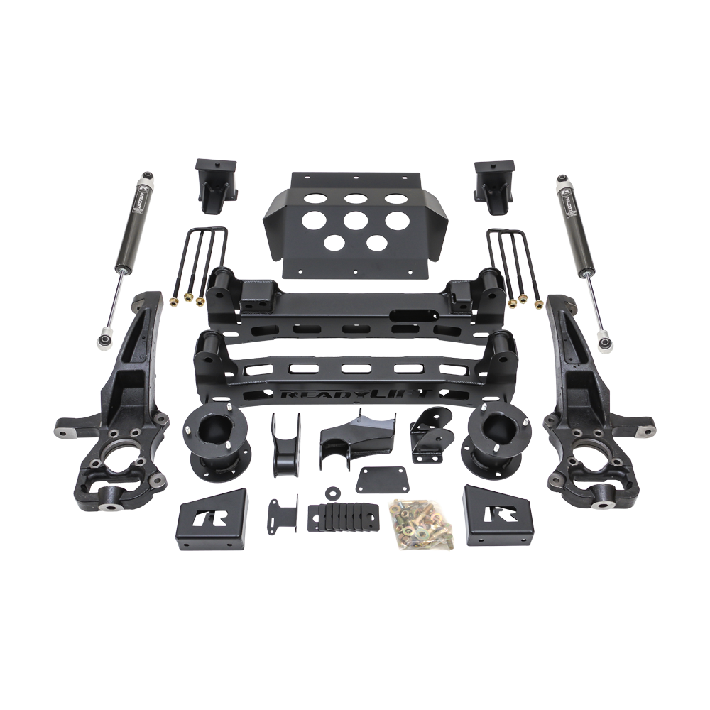 Maintains the factory ride and handling. Delivers clearance for increased aftermarket tire sizes - up to 35'' on 6-inch kit on 9" wide wheels with 0 offset with no trimming. Top mount strut extensions maintain factory geometry and retains use of the factory strut. 3/16-inch thick steel plate cross members and skid plate. Anti-torsion boxed and gusseted plate steel differential drop brackets. Fabricated steel 5" rear lift blocks include integrated bump stop landings, offset pin and provides proper pinon angle. Includes premium Falcon 1.1 Monotube Shocks extended length rear shocks. Includes ReadyGuard Powertrain Warranty. Note: Use of Auto 4 Hi feature not recommended. Note: Not for use on Trail Boss, AT4, Diesel or Denali models. Note: Not compatible with Adaptive Ride Control suspension.