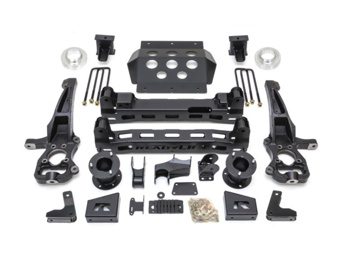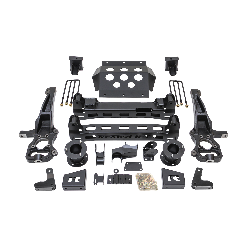 The 44-39610 lift kit utilizes the very best in ReadyLIFT engineering with boxed steel front/rear cross members and full-width front skid plate constructed of thick 3/16" plate steel. New 1/4-inch boxed plate steel differential drop brackets feature a double gusset and boxed center rib to take the abuse of front differential torsional twisting. Our 6" lift kit features heavy-duty angled and offset top mount strut extensions that realigns the struts to optimize shock performance and minimize wear. A specially designed lower mount strut pre-load spacer offers the added benefit of a slight increase in spring rate to better handle the larger wheels and tires that will find their way onto this new lifted truck. To lift the rear, new 5" tall fabricated steel rear blocks with integrated bump stop landings have been added as well as new rear shock extensions to retain full functional use of the factory ARC rear shocks. With over 9 months of engineering and development and more awesome features than we could possibly mention, the bottom line is this new Big Lift Kit is the best 6" lift kit you can install on a new body style 2019-2022 GM 1500 4WD truck! Thousands of miles of road and trail testing have proven our new 6" lift kit makes these new GM 1500 trucks ride better than stock! Wheel and tire fitment information: 44-39610 6" Lift Kit - Recommended max tire with no trimming: 20x9 0 offset - 35x12.50 tire. *Max with trimming: 20x10 -18 offset - 35x12.50 or 325/60R20 *Trimming requirements for larger than recommended wheel/tire include front valance, front felt liner edge, rear felt liner edge and front-rear well edge mud flap.