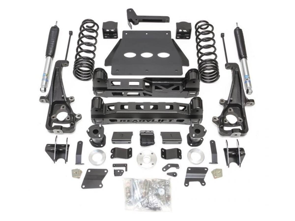 The new Ram HD trucks are more popular than ever and our ReadyLIFT 6” lift kit we introduced two years ago has been an extremely popular lift option. How can we take an already great 2019-2022 Ram HD 6” lift kit and make it better? How about adding a new CNC-machined billet Aluminum transfer case clocking ring to reposition the transfer case pinion angle? Some Ram HD trucks can experience a slight vibration after lifting due to driveline angle sensitivity. Our new 49-1961 6” lift kit addresses that inherent driveline system issue with the addition of a heavy-duty transfer case clocking [indexing] ring and new transmission crossmember. This Driveline Indexing System (DIS) combination works great with our ReadyLIFT 6” lift kit while re-positioning the transmission and pinion position for a smooth driving experience on or off road. Kit 49-1961 includes everything in our popular 49-1960 6” lift kit as well as these new DIS re-positioning components. Heavy duty and great riding 6” lift front springs, 3.5” lift rear coil spring spacers, heavy-duty radius arm drop brackets, heavy-duty fabricated steel front and rear track bar brackets, dropped cast iron pitman arm, front/rear sway bar relocation brackets and bump stop extensions preventing over- compression of the new Bilstein 5100 series front/rear shocks are all included in this premium kit. For use on diesel 2500 trucks only.