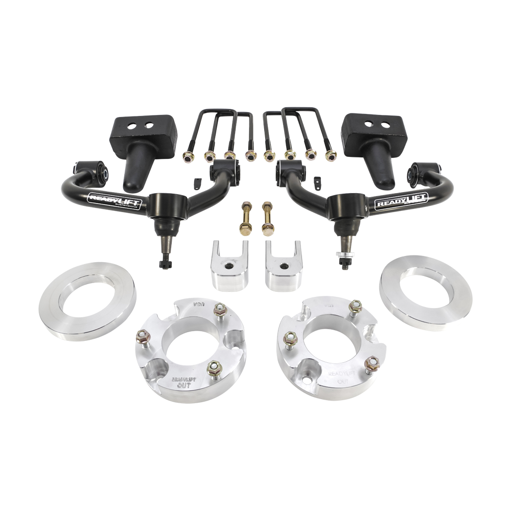 Introducing the ReadyLIFT 69-21350 3.5” SST Lift Kit exclusively engineered for the new 2021 Ford F-150 4WD pickups. This new SST lift kit is a second-generation version of our popular 69-2300 3.5” SST lift kit for the 2020 and older models. Many of the same premium features found in that kit have migrated to the new 69-21350 kit such as the front CNC-machined billet Aluminum lift components and our popular tubular control arms with corrected ball joint pivot angles. New 2021 F-150-specific heavy-duty ball joints and brackets for auto-leveling headlights have been engineered into the new control arms and each kit also contains (4) alignment cam plates. Rear components include 2.5” tall precision fabricated steel rear lift blocks with new longer U-bolts gives the 2021-2022 F-150 a nice, nearly level stance with minor rake. This new lift kit includes new rear shock extensions so you can retain use of your factory rear shocks. (Note: Lift amount may vary between 3.25" and 3.5" of front lift depending on the vehicle). Rear lift is equal to approximately 1.25". Allows for up to a 295/60-20 tire on a 20x9 +18 wheel. Can run 35x12.50 with 0 offset but requires some trimming. Can run the factory 20x8.5" +44 wheels with a tire narrower than 11.50" wide. Works with auto-leveling headlamps and CCD. NOTE: Excludes Tremor Edition