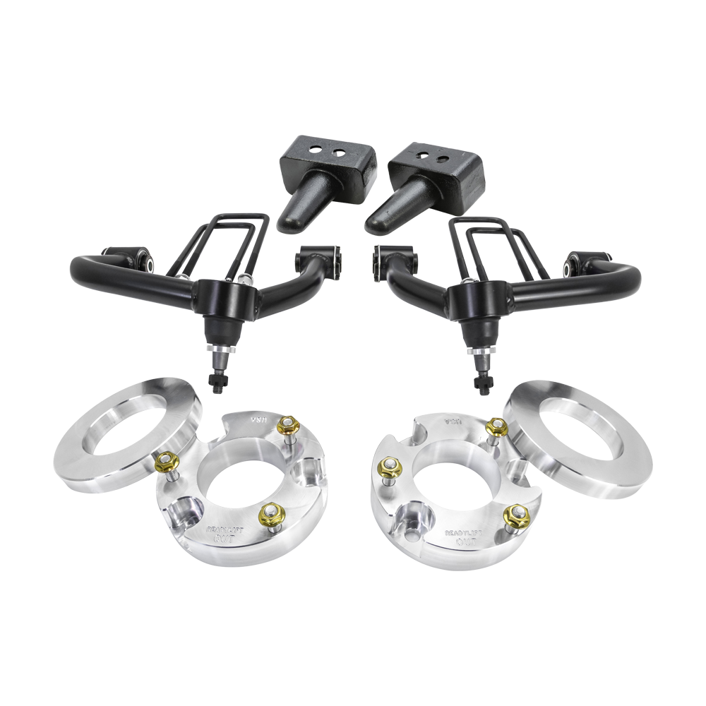 New - now includes ultra strong TCT free floating pivot bushings that are self lubricating and eliminates friction. The ReadyLIFT 3.5" SST Lift Kit is developed to give 2015-2020 F-150 owners a packaged front/rear lift option that lifts the front of the vehicle 3.5" with 2" in the rear. This creates a popular overall lifted stance that isn't too high, but high enough to allow for 35x11.50 tires. These lift systems capitalize on the popularity of our tubular control arm design SST lift kits while incorporating many great advanced features. AND they are super easy to install! Like many of our popular lift kit systems, these new SST lift kits are centered around our DOM tubular steel Upper Control Arms. Crafting the right arm for the job was critical in the development of this kit design. Our team produced a superior arm that includes a 14-degree ball joint cup to insure proper geometry and alignment. This translates into long tire life as well as excellent handling. Each arm includes our proprietary ReadyLIFT ball joint - the same heavy duty ball joint used in our 3/4-ton truck lift kits. And each arm includes new one-time grease TCT polyurethane bushings. The 3.5" of lift height is achieved using our unique offset top mount spacer design. These CNC-machined billet aerospace-grade Aluminum lift spacers feature a unique offset bolt design engineered to position the strut into the stock position. This translates into proper suspension clearance and guarantees your truck will ride like it was stock. Additionally, we include a machined billet pre-load spacer that installs between the top of the spring and the bottom of the strut hat to pre-load the spring. This also acts as a droop limiter which insures CV axles durability on 4WD models without exceeding the CV limits which works well within the OEM tolerances. To lift the rear we include OEM style 3" tall cast rear lift blocks with built in bump stop landing pads. These blocks include dual locator pins.. For trucks with a two-piece driveshaft, we also include a carrier bearing spacer - All of this contributes to an excellent driving and handling suspension system that truly upgrades your Ford F-150 truck! NOTE: Not for use on trucks that are factory pre-lifted/leveled or that have the "off-road package". Check factory height prior to ordering or installing. Trucks with more than 22" of wheel hub to fender lip height may require less lift.