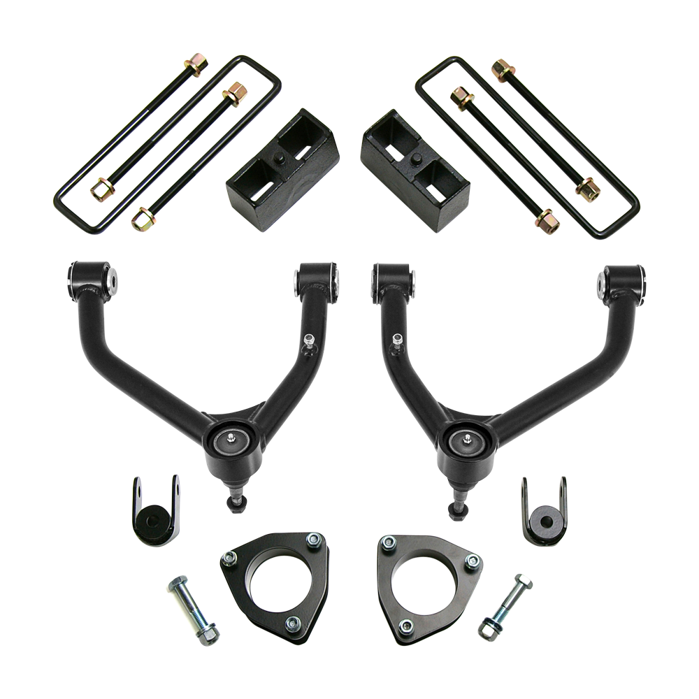READ FIRST For NEW 2014-UP GM1500 4WD. *New Improved UCA Assembly Max Lift - 4.0"F/1.75"R - Max Tire: 33". Not for use on pre-2014 GM 1500 trucks. Does Not Work With AWD Denali Trucks. For Trucks with Aluminum Alloy or Stamped Steel Front Suspension Only. Not for use on cast steel suspension. ReadyLIFT 69-3414 4" SST Lift Kit for the NEW 2014-UP GM 1500 4WD Trucks with Aluminum Alloy and Stamped Steel Front Upper Control Arm Suspension. Standard Z71 okay. Note: Some 2016 models are coming with a New Hydro Form (Stamped) UCA and LCA and Aluminum Alloy front upper control arms. Stamped steel models can be identified with a build code of "AVV". 69-3414 works on both Aluminum and Stamped Steel front suspension trucks only. Not for use on Cast Steel suspension trucks. The 69-3414 kit is for use on trucks with the factory aluminum or stamped steel upper and lower control arms. Not for use on trucks with cast steel upper control arms. Z71 standard suspension okay. NOTE: The ReadyLIFT 69-3414 SST Lift Kit is designed for use with Aftermarket Wheels with a backspacing of 5.25". If you intend to run the stock wheels with an aftermarket larger tire, a wheel spacer is required to prevent the tire from touching the control arm at full locked turn. ReadyLift has developed a CNC-machined billet aluminum wheel spacer 10-3485 for use with factory wheels which have the stud pockets cast into the wheel next to the lug holes on the back side of the wheel. To run the OE/Factory wheels AND tires, you will need to use the "ReadyLIFT 1/2" Billet Wheel Spacers for use with OE/Factory wheels and tires". Kit Includes: (2) Front SST 4.0" Strut Extensions, (2) Rear Shock Extension Brackets, (2) OEM-Style 3.0" Rear Lift Blocks With U-Bolts, (1) Steel Skid Plate, (2) CNC-Machined Differential Drop Spacers, (2) DOM Tubular Control Arms With New Evolution Heavy Duty Pre-Pressed Ball Joints, (8) New Polyurethane Greaseable Bushings with Backing Spacers for Extended Life, Instructions & All Necessary Hardware. Note: Not for use on AWD Denali Trucks. Will NOT work with trucks with cast steel Upper Control Arms Not for use for off roading purposes. if you plan to off road your vehicle, please select the kit version with uniball upper control arms.