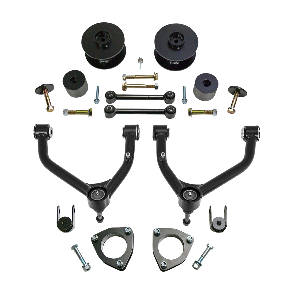 NEW - Now includes ultra strong TCT free floating pivot bushings that are self lubricating and eliminates friction. ReadyLIFT is proud to offer a SST Lift Kit system for the 2015-2020 1500-series GM 6-lug 4WD SUV/SUTs with factory Aluminum suspension. The 69-3496 4.0" SST Lift Kit is the result of over six months of extensive product development followed by rigorous on and off road testing. ReadyLIFT's goal is to provide a true 4.0" lift kit that is completely bolt-on; no drilling, cutting or welding required. This system significantly increases ground clearance while allowing for tire sizes up to 33" tire on an aftermarket wheel. The most common tire size for this application is 33x12.50 (max). In order to install a 33x12.50 (305/55/20) with aftermarket wheels, some minor trimming of the inner fenderwell may be required. 22x9.5 with 5.5" backspacing requires no fender modifications. 17x9 +0 offset on a 285/70R17 will fit with no rubbing. With a 295/70r17 minor trimming/modification required. Note: This kit is designed for use with aftermarket wheels. Not for use on AWD vehicles. The ReadyLIFT 4.0" SST Lift Kit will raise the 2015-2020 Chevy Suburban, Chevy Tahoe and GMC Yukon 1500 4WD SUVs 4.0" in front thanks to tough trail-proven 4.0" powdercoated steel strut extensions that bolt directly to the top of the factory strut. Unlike some kits which require you to cut off your strut studs or break the top hat seal which are irreversible modifications, our rugged strut extensions require No Modifications to be made to the strut in order to install the extension. This guarantees the strut will maintain the factory integrity as well as drastically reducing installation time. Two key products were developed to make achieving 4" of lift without modifications a possibly. At the heart of the system is our all-new 100% DOM tubular upper control arm. This new heavy-duty control arm features OEM-style ball joints pre-pressed into a strong crown that retains OEM geometry throughout the suspension cycle and doesn't require any modifications to the spindle. That means no drilling or machining to make the ball joints fit the spindle. The new Control Arms include TCT polyurethane bushings. The second important product that makes this kit possible is our Patent Pending CNC-machined 6061-T6 billet Aluminum differential drop brackets. When raising the front suspension 4.0" the differential must be lowered to maintain front axle and CV angles. ReadyLIFT has engineered a differential drop system that cuts installation time in half compared to other similar kits. Unlike other differential drop brackets made from steel plate that bends and can cause CV failure, our CNC-machined brackets cannot ever bend, break or cause any driveline problems when using 4WD mode. That is guaranteed! Accompanying our patent pending differential drop brackets is a thick powder coat plate steel skid plate that utilizes the factory attachment locations for ease of installation while providing tough differential protection when off roading. To lift the rear of the GM coil spring-equipped SUVs, this lift system includes 3.0" powder coat steel coil spring spacers. The strong coil spacers insert into and top of the factory spring which maintains the great factory ride! In addition, a slight rake is helpful for towing or hauling. New longer and stronger rear sway bar end links and bump stop extensions are also provided to keep the rear suspension working properly. Completing this great new lift system are a set of steel rear shock extensions. No need to replace your great-riding factory rear shocks with inferior aftermarket shocks. These new shock extension brackets keep the rear shocks in the factory mounting position which means your truck will ride great! And that's important! Like all ReadyLIFT products, the 69-3496 SST Lift Kit System is protected by our Limited Lifetime Warranty and ReadyGuard PowerTrain Warranty. NOTE: Note: This kit is designed for use with aftermarket wheels. NOTE: If you intend to run the stock wheels and tires, a wheel spacer is required to prevent the factory tire from touching the control arm at full locked turn. ReadyLIFT has developed a CNC-machined billet Aluminum wheel spacer 10-3485 for use with factory wheels which have the stud pockets cast into the wheel next to the lug holes on the back side of the wheel. NOTE: Installation of these kits may cause rear axle shift and an adjustable rear track bar or drop bracket may be required. NOTE: Will not work with rear airbag suspension.