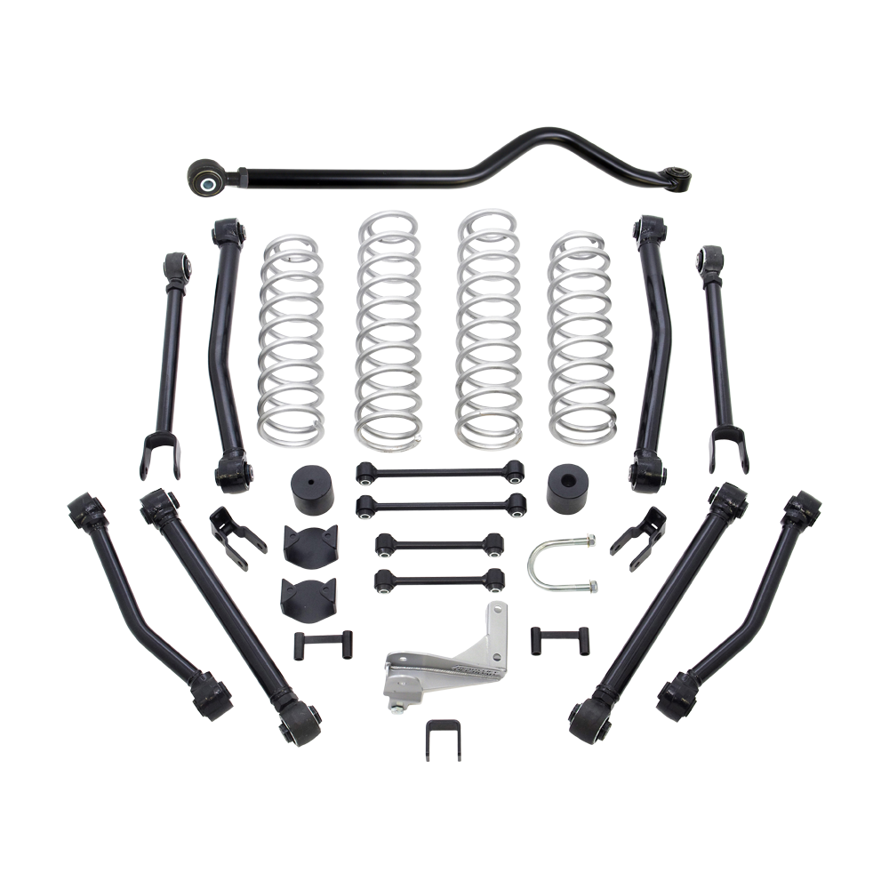Professional Suspension at a Reasonable Price! ReadyLIFT Suspension is happy to announce that we have developed a 8-Arm Lift Kit category for the Jeep JK Wrangler that is made right here in the U.S.A. These exciting 8-Arm Terrain Flex Lift Kits are designed to maximize the Jeep owners on and off road experience without having to break the bank! The 69-6408 4" 8-Arm Terrain Flex Lift kit features our new proprietary Heavy Duty DOM tube steel Control Arms with TCT - Terrain Control Technology flex joints integrated into our popular coil spring lift kits. This lift kit requires longer shocks - available in kit 69-6409. 69-6408 DOES NOT include longer shocks. The ReadyLIFT Jeep JK 4" Terrain Flex 8-Arm Lift Kits are a great option for the Jeep owner who wants more than just a lift kit, but doesn't require the need for an over-the-top expensive long-arm suspension system. Our new Control Arms feature our TCT - Terrain Control Technology flex joints contained in heavy duty forged housings that bolt right up in replacement of the inferior OEM Control Arms. This new 8-arm system allows the Jeep owner to have a lifted JK that rides great and performs outstanding even in the roughest terrain. If you want the best lift component offering in a kit that doesn't break the bank, our new 8-arm SST Lift kits are exactly what you need. Available in both 4" and 2.5" lift heights, these kits also include important bolt-on accessories such as a specially designed plate steel rear track bar bracket to correct roll center and track bar placement, a new heavy-duty front track bar and extended length sway bar end links keep your JK handling properly. ReadyLIFT 4" Terrain Flex 8-Arm Lift Kits are designed for use on ALL Jeep JK Wrangler 2-door & 4-door vehicles and like all ReadyLIFT products, are covered by our ReadyGuard Powertrain Warranty. NOTE: 2012-UP JKs may require front driveshaft and exhaust modifications for off road use. NOTE: 4.0" Lift - max 37" Tires with flat fenders. 35" with stock fenders