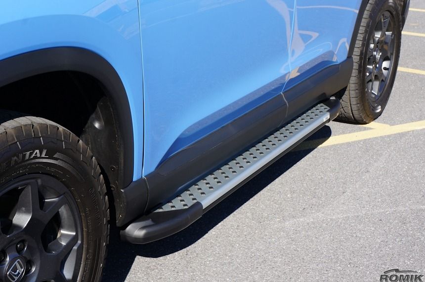 RAL Runing Boards are the newest European design from the Romik labs. The "Patent Pending" RAL is made from aircraft quality triple wall aluminum extrusion and it is complemented by black end caps with grip assurance technology. With safety and style in mind RAL will set your vehicle apart from the rest. RAL is available in Silver or all Black. FITMENT NOTES: Requires undercarriage panel trimming Visible gap due to body design Will not fit with mudflaps