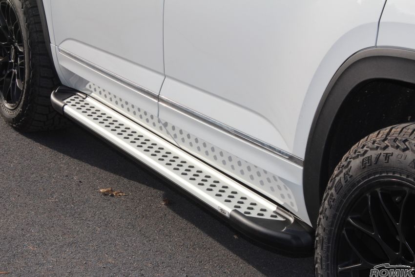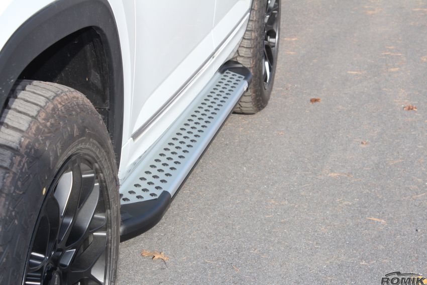 RAL Runing Boards are the newest European design from the Romik labs. The "Patent Pending" RAL is made from aircraft quality triple wall aluminum extrusion and it is complemented by black end caps with grip assurance technology. With safety and style in mind RAL will set your vehicle apart from the rest. RAL is available in Silver or all Black. FITMENT NOTES: Requires undercarriage panel trimming Visible gap due to body design