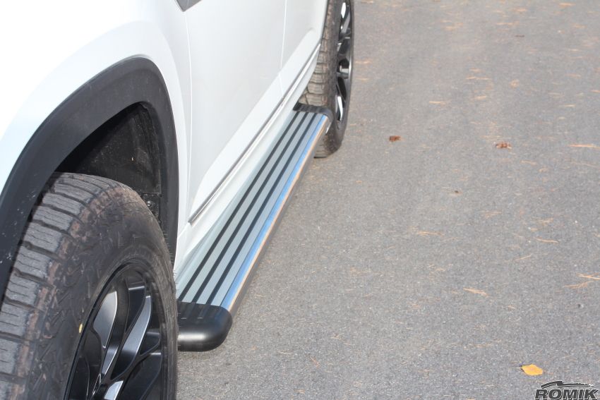 Romik RB2 Luxury Side Step Series are the newest European design from the Romik labs. Upgrade your vehicle’s function and fashion in one easy Step RB2 running boards are made from aircraft quality triple wall aluminum extrusion that are twice as thick as our competitors and are complemented by black end caps with grip assurance technology. With safety and style in mind RB2 will set your vehicle apart from the rest. The Romik RB2 compliments the lines of your vehicle and gives the occupants sure footing. Sold in pairs, the Romik RB2 Running Boards include vehicle specific mounting brackets and hardware. RB2 running boards are backed by a limited lifetime warranty.