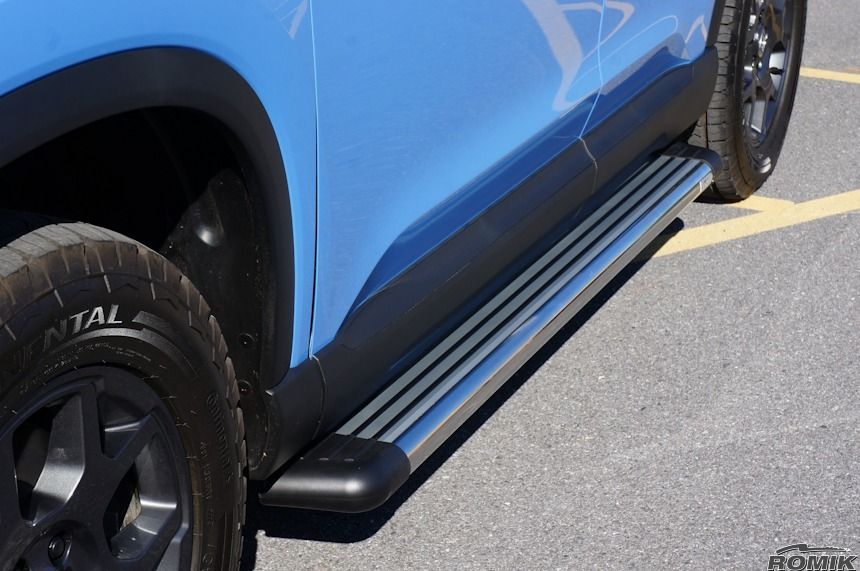 Romik RB2 Luxury Side Step Series are the newest European design from the Romik labs. Upgrade your vehicle’s function and fashion in one easy Step RB2 running boards are made from aircraft quality triple wall aluminum extrusion that are twice as thick as our competitors and are complemented by black end caps with grip assurance technology. With safety and style in mind RB2 will set your vehicle apart from the rest. The Romik RB2 compliments the lines of your vehicle and gives the occupants sure footing. Sold in pairs, the Romik RB2 Running Boards include vehicle specific mounting brackets and hardware. RB2 running boards are backed by a limited lifetime warranty. FITMENT NOTES: Requires undercarriage panel trimming Visible gap due to body design Will not fit with mudflaps