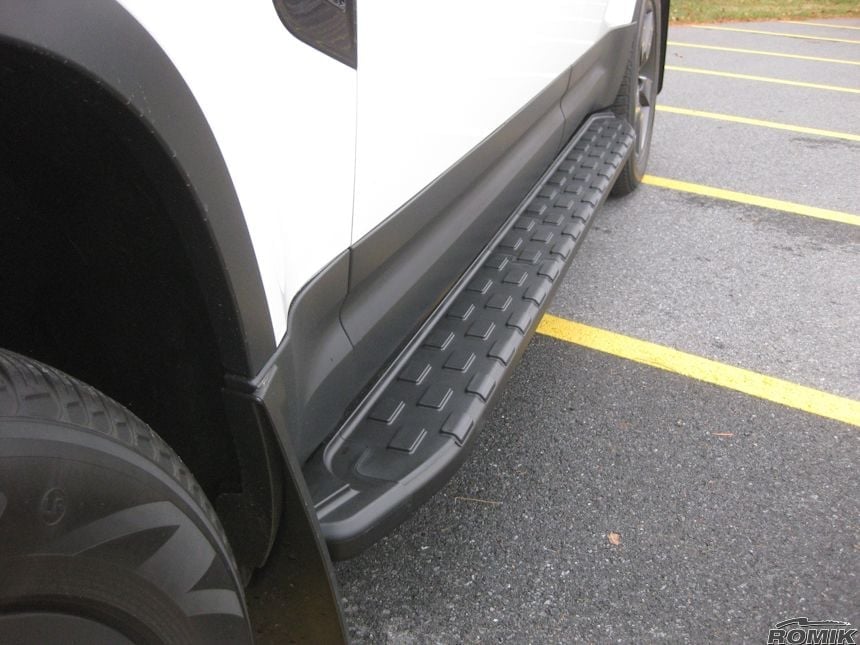 Romik's REC Running Boards are the newest European design from the Romik labs. Upgrade your vehicle’s function and fashion in one easy Step; Romik REC running boards are made from aircraft quality aluminum extrusion and are complemented by black end caps with a non-skid surface for sure footing. With safety and style in mind REC will set your vehicle apart from the rest. The Romik REC compliments the lines of your vehicle and gives the occupants sure footing. Sold in pairs, the Romik REC Running Boards include vehicle specific mounting brackets and hardware. REC running boards are backed by a 5-year warranty. FITMENT NOTES: Requires undercarriage panel trimming Visible gap due to body design Will not fit with mudflaps