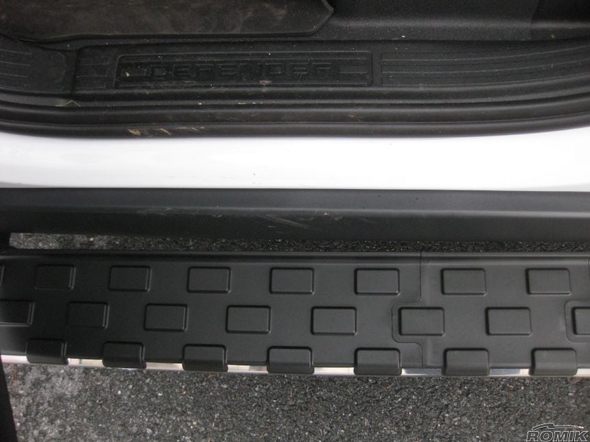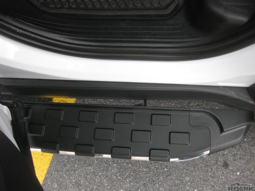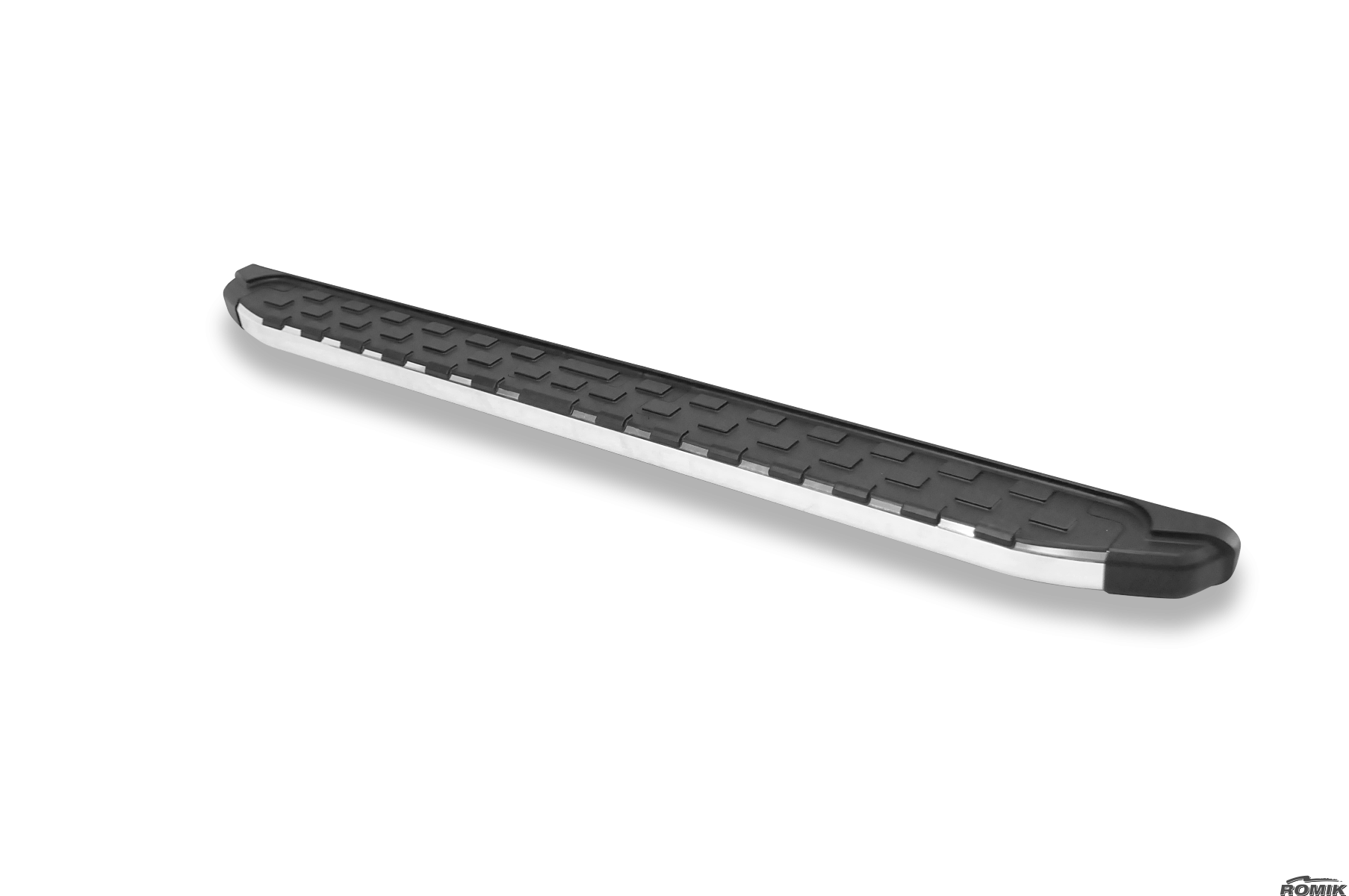 Romik's REC Running Boards are the newest European design from the Romik labs. Upgrade your vehicle’s function and fashion in one easy Step; Romik REC running boards are made from aircraft quality aluminum extrusion and are complemented by black end caps with a non-skid surface for sure footing. With safety and style in mind REC will set your vehicle apart from the rest. The Romik REC compliments the lines of your vehicle and gives the occupants sure footing. Sold in pairs, the Romik REC Running Boards include vehicle specific mounting brackets and hardware. REC running boards are backed by a 5-year warranty. FITMENT NOTES: Requires undercarriage panel trimming Visible gap due to body design