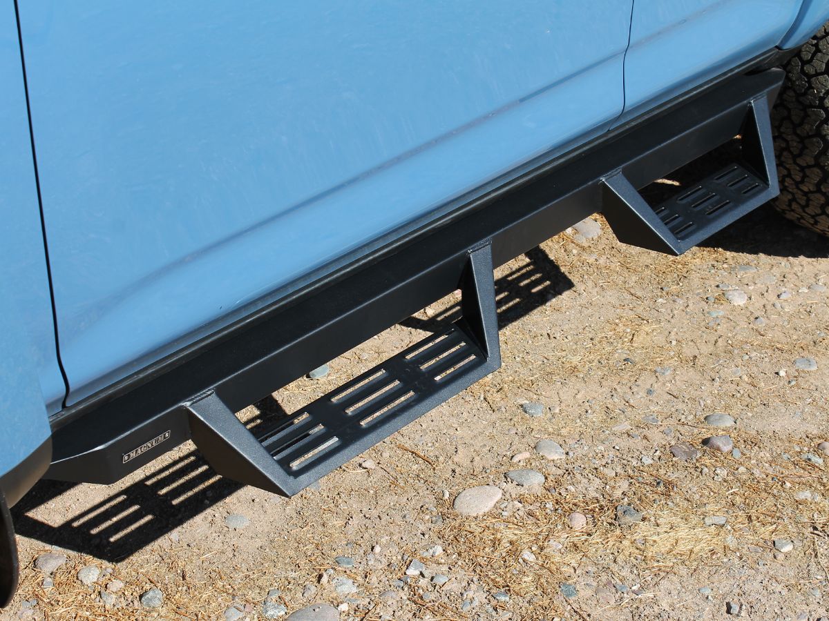 Magnum RT Gen 2 Steps are the 2.0 version of the original RT Step. They are 30% longer and wider with a die stamped slotted step area providing increased traction to securely step into the vehicle in any weather condition. They have a unique modern angled drop step design for easy and comfortable entry into the vehicle. Made from 14 gauge steel and finished with a 3 stage black powder coating system. Quality guaranteed with a limited lifetime manufacturer warranty on the workmanship/structure and a 10 year limited manufacturer warranty on the black powder coated finish.