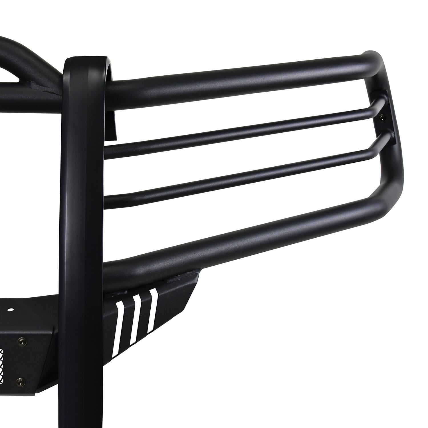 Westin's Sportsman X Grille Guard effectively combines aggressive styling with heavy duty front end protection. Engineered to provide both great looks and performance, Sportsman X’s unique design compliments today’s larger grille designs, and is available to fit most full and mid size truck applications. Sportsman X has an optional detachable mesh panel (sold separately) which is specifically designed to fit the opening in the center section of Sportsman X Grille Guard, or can be removed to accommodate the flush mounted 26” dual row LED light bar (sold separately). A smaller removable mesh panel designed for the factory sensor location opening is included as standard with Sportsman X. For specific Chevy and Dodge/RAM applications a Sportsman X Sensor Kit (sold separately) is available. An exterior step plate is located on the 1-5/8” bottom tube to provide easy access to the engine compartment. Built with heavy duty 2-1/4” upright rubber strips and 1- 5/8” outer tubes, Sportsman X Grille Guard is designed to provide protection and style for years to come.