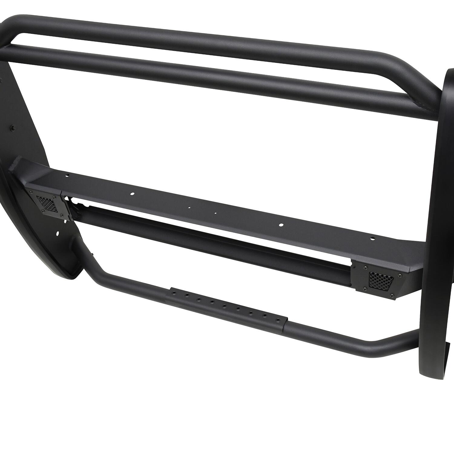 Westin's Sportsman X Grille Guard effectively combines aggressive styling with heavy duty front end protection. Engineered to provide both great looks and performance, Sportsman X’s unique design compliments today’s larger grille designs, and is available to fit most full and mid size truck applications. Sportsman X has an optional detachable mesh panel (sold separately) which is specifically designed to fit the opening in the center section of Sportsman X Grille Guard, or can be removed to accommodate the flush mounted 26” dual row LED light bar (sold separately). A smaller removable mesh panel designed for the factory sensor location opening is included as standard with Sportsman X. For specific Chevy and Dodge/RAM applications a Sportsman X Sensor Kit (sold separately) is available. An exterior step plate is located on the 1-5/8” bottom tube to provide easy access to the engine compartment. Built with heavy duty 2-1/4” upright rubber strips and 1- 5/8” outer tubes, Sportsman X Grille Guard is designed to provide protection and style for years to come.