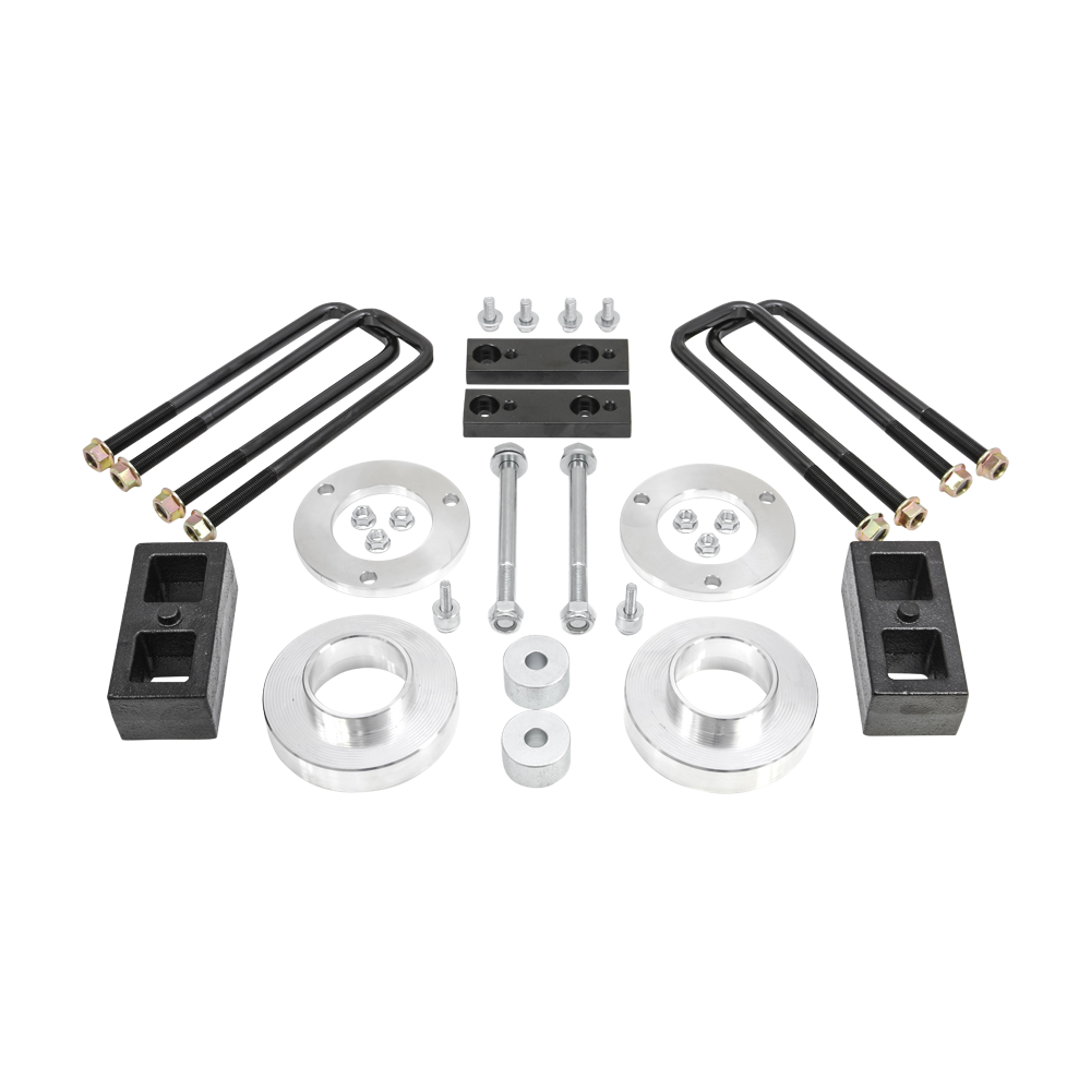 ReadyLIFT offers a pre-load lift style SST Lift Kit for the 2005-2023 Toyota Tacoma 2WD/4WD 6-lug trucks. Our traditional top mount strut extension 3" SST lift kits have been extremely popular for the past decade, but some customers favor a pre-load style lift kit, so we have added this lift technology to our product portfolio. Now you have more ReadyLIFT quality choices when it comes to lifting a Toyota Tacoma! ReadyLIFT's 69-5530 3/2 SST lift kit provides 3" total lift in front and 2" of lift in the rear. This new kit utilizes a precision crafted CNC-machined billet Aluminum pre-load spacer that installs between the factory spring and the top hat. This design slightly increases front spring rate, reducing nose dive during braking and improving front roll during hard turning at speed. Like our traditional Tacoma lift kits, the new 69-5530 lift kit includes 1" differential drop spacers and hardware, sway bar drop spacers, and skid plate spacers. For the rear we include our legendary OE style cast iron rear lift blocks with proper taper and longer U-bolts. This new Tacoma 6-lug SST Lift Kit enhances the factory driving mannerisms with a slightly more firm ride and handling characteristics thanks to the pre-load spacer. This kit allows for up to a 285/65-18 tire on an 18x9 wheel with +18 mm offset. (Minor trimming may be required depending on tire brand and tread design).