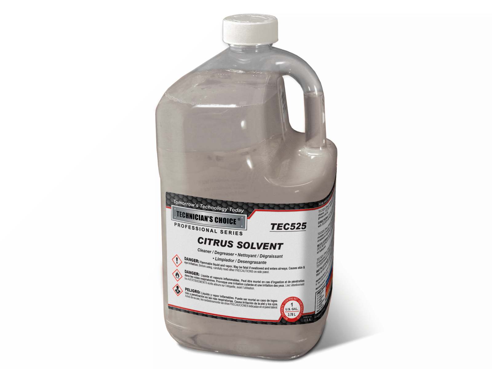 Technician’s Choice® TEC525 Citrus Solvent Cleaner/Degreaser…A powerful D-limonene and odorless mineral spirit based cleaner. Melts or removes tar, dissolves grease, grime and oil deposits from engines. Emulsifies grease and oil.