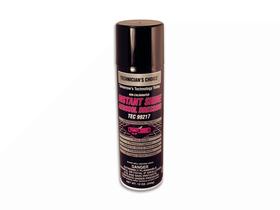 Introducing Technician’s Choice® TEC99217 Instant Shine Aerosol Dressing…Fifty state compliant formula. Fast drying release agent and conditioning spray for vinyl, rubber, plastic, painted interior and exterior surfaces. High gloss protectant penetrates deep into surfaces. Fortified with silicone, just spray and walk away. Leaves a long lasting, waterproof shine.
