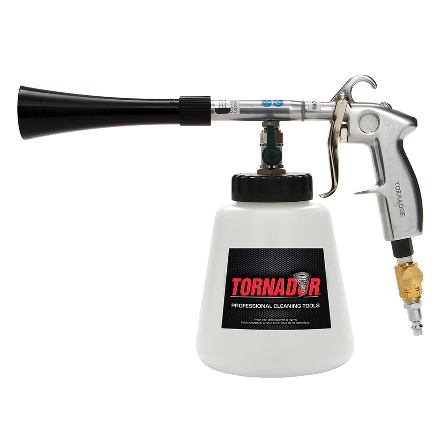 The Z-020 Tornador Black has increased power, reduced air consumption and noise. Plus, the Tornador Black is equipped with sealed ball bearings inside the rotation set. Wear is minimized because the rotation set no longer comes into contact with the cone. The Tornador Black better suited for long term, frequent use, as in a professional detailing capacity. The Z-020 Tornador Black can be used for all the same applications as the Tornador Classic, but the Black is more effective on persistent spots and heavily soiled areas. The cone-shaped nozzle and oscillating tip create a Tornador cleaning action that cleans hard and soft surfaces like nothing you’ve seen before. Dirt and grime are immediately released from fabrics, carpet, and solid surfaces. The Tornador Black releases a fine mist of cleaning solution that does not over saturate surfaces, simply wipe with a microfiber towel. Then turn the dial to shut off the water and use the compressed air to dry the cleaned area. It also works great on the dashboard, door panels, steering wheel, fabric upholstery, carpet, floor mats, and between seats. It cleans in tough-to-reach places between seats and in seams. Use the Tornador Black to clean fabric convertible tops, body seams, detailing of wheels, and emblems. There’s no need to scrub. The Tornador Black has an air regulator to allow you to change the working pressure directly on the tool. What this means is that you can adjust more pressure and cleaning fluid.