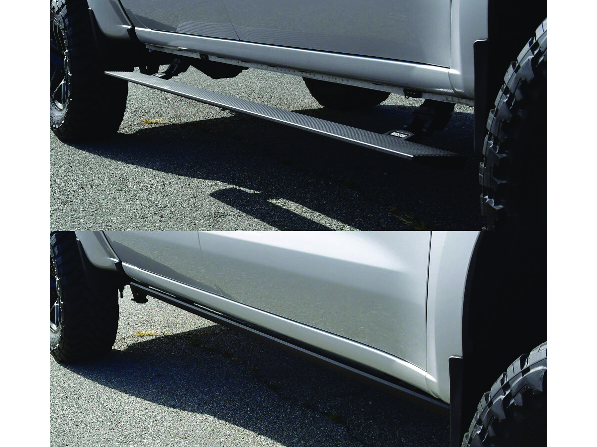 Introducing the all-new Westin Pro-e Running Boards, a superior upgrade that combines the functionality and appearance of your Truck, Bronco, Jeep or SUV. The Pro-e Running Boards are designed with a practical feature that automatically deploys when the vehicle's door is opened. This allows for easy entry and exit. When the door is closed, the running boards smoothly retract, seamlessly integrating with the vehicle's body and maintaining its sleek appearance. Equipped with two waterproof IP68 rated motors per side, these running boards are engineered for durability and reliability in any weather condition. The integrated LED lights illuminate the 6-inch wide, durable aluminum step surface, ensuring enhanced visibility and safety. Whether it's day or night, you can confidently step onto these running boards with their impressive weight capacity of up to 300 lbs. per side. The Pro-e Running Boards are constructed from corrosion-resistant aluminum and finished with a durable textured black powder coat. The included vehicle-specific mounting brackets and hardware guarantee a seamless installation process, ensuring a perfect fit for your vehicle.