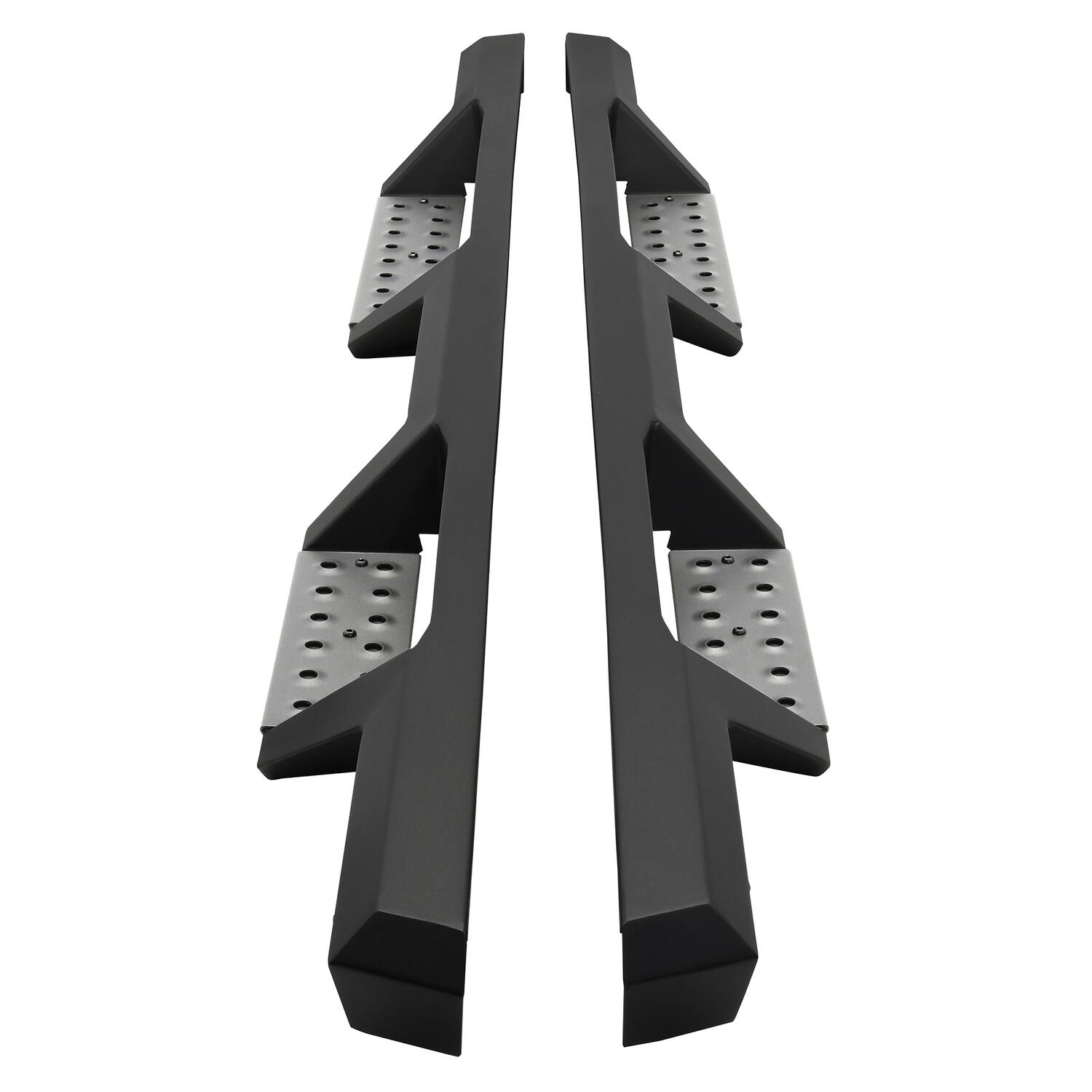 These Nerf bars offer solid 1-piece construction in your choice of stainless or mild steel that's primed to endure. The heavy-duty removable die-stamped foot plates create a high-traction step area that ensures safe footing even in the toughest conditions. Our signature notched bar design truly sets the HDX Drop Nerf Bars apart. They offer more than 2 extra inches of toe/heel placement when compared to our competitors - you won’t have to tiptoe around functionality. Clad in a textured black or stainless powder-coated finish, these side steps are a flawless addition to any truck, SUV or off-roader. They’re finished with corrosion-resistant powder-coat (even in the stainless finish option) and feature a die-stamped stainless steel step area for ultimate durability and traction. They install snugly against your rocker panels, providing a solid fit with a rugged look that protects rocker panels from damage. HDX Drop Nerf Bars come with a vehicle-specific mount kit, complete with all the installation hardware and instructions you'll need. There's no drilling required for most applications, and you can choose from a cab length or wheel-to-wheel style. Simply bolt them on and elevate your truck's aesthetics and functionality today.