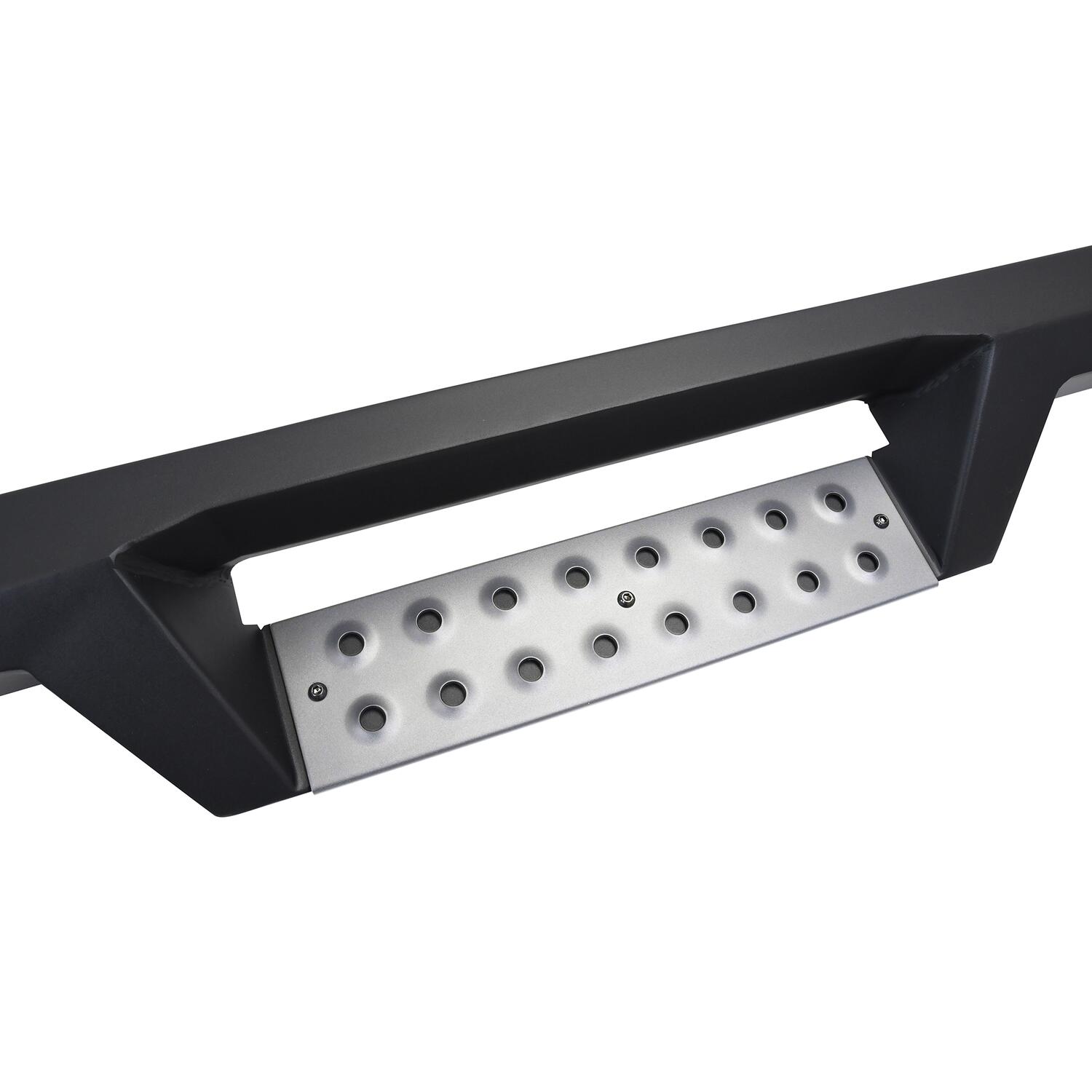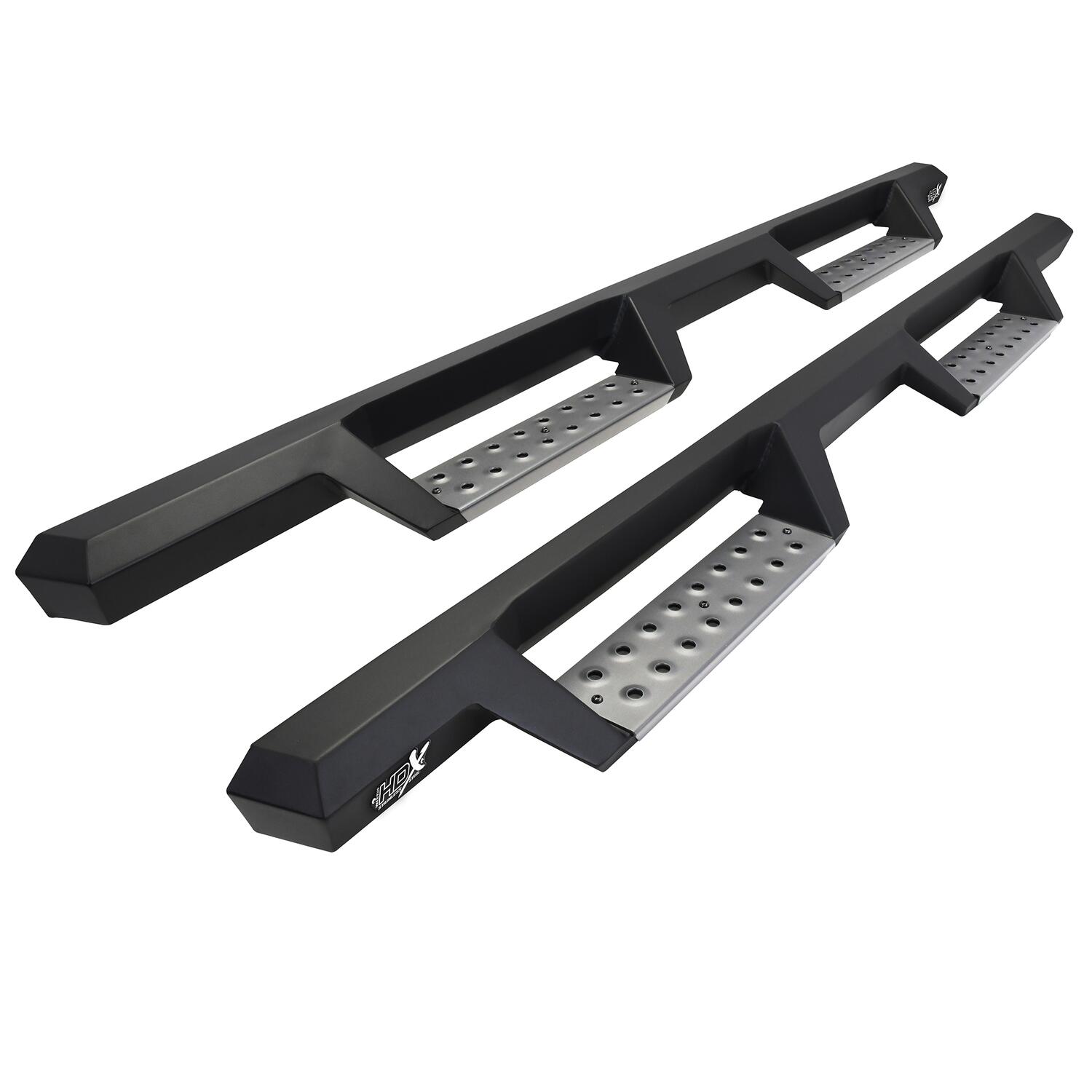 These Nerf bars offer solid 1-piece construction in your choice of stainless or mild steel that's primed to endure. The heavy-duty removable die-stamped foot plates create a high-traction step area that ensures safe footing even in the toughest conditions. Our signature notched bar design truly sets the HDX Drop Nerf Bars apart. They offer more than 2 extra inches of toe/heel placement when compared to our competitors - you won’t have to tiptoe around functionality. Clad in a textured black or stainless powder-coated finish, these side steps are a flawless addition to any truck, SUV or off-roader. They’re finished with corrosion-resistant powder-coat (even in the stainless finish option) and feature a die-stamped stainless steel step area for ultimate durability and traction. They install snugly against your rocker panels, providing a solid fit with a rugged look that protects rocker panels from damage. HDX Drop Nerf Bars come with a vehicle-specific mount kit, complete with all the installation hardware and instructions you'll need. There's no drilling required for most applications, and you can choose from a cab length or wheel-to-wheel style. Simply bolt them on and elevate your truck's aesthetics and functionality today.