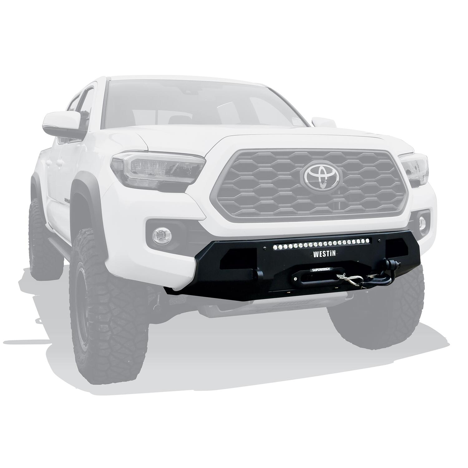 Pro-Series Mid Width Front Bumper The Pro-Series Mid Width Front Bumper from Westin has a great looking and highly functional design. The distinctive low-profile bumper design retains the OEM bumper factory styling, while adding a winch capable platform engineered to accommodate 8,000-12,000 lb. synthetic rope winches with a hawse fairlead. The recessed hawse fairlead helps to achieve proper approach angles. It features large winch area access holes for easier operation, and provides two additional recovery/mounting points. To give you even more visibility, the Pro-Series fits an optional single row 20” LED light bar (sold separately). It is also available with your choice of two (2) attractive Bull Bar Styles (round and angular)(Toyota 4Runner only), that provides added grille protection. This heavy-duty bumper upgrade is built to last, constructed of a stout 10-gauge steel outer shell, with a beefy heavy-duty 4-gauge center section for easy installation. This design features a durable textured black powder coat finish with an e-coated base coat, providing long lasting corrosion protection from the elements, and is backed by a 3-year warranty. The Pro-Series Wid Width Front Bumper from Westin comes complete with all mounting brackets and hardware. Pro-Series Front Bumper The Pro-Series Front Bumper from Westin is an attractive, heavy duty, "winch capable" upgrade. Keep your OEM features while achieving looks and functionality. Built for adventure, this bumper is ready for anything standing in its way. The Pro-Series was engineered to improve both approach angles and ground clearance for enhanced off-road capabilities. Constructed with a 10 gauge steel bumper shell the Pro-Series is designed for maximum strength and durability. With a heavy duty 1/4" steel center section capable of holding a 12K lbs. winch and welded recovery mounting points, this is all the reassurance you need. Keeping safety in mind, this bumper has provisions for the factory proximity sensors while housing either a single, or double-row 20" LED light bar (sold separately) for those late night excursions. Finished in a 2-stage treatment, the durable E-coat and black textured finish is surely built to last. Includes all the necessary mounting hardware for a "hassle free installation". Backed by a 3-year warranty Westin has you covered. Pro Series is available for Ford, Chevy, Ram and Toyota applications. Add the matching Pro-Series Rear bumper to complete the look and take your truck to the next level.