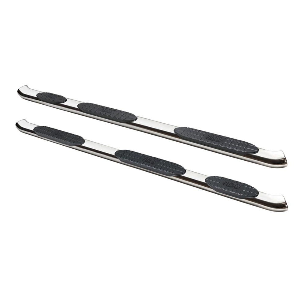 Westin Pro Traxx 5 inch nerf step bars feature a 5 inch oval tube with a heavy-duty step pad that gives you a wider and more secure step area. This will make sure it is safer and easier to get into your vehicle. The bars have a 30 degree bend at each end and seamless domed end caps so there are no seams or exposed bolt heads. This gives the Pro Traxx a clean and finished look that most other bars can't come close too. The bars come in two finishes, stainless steel or a black powder coated steel. Installation is bolt-on so there is no drilling into your vehicle and these are backed by a Westin warranty. The stainless bars have a lifetime warranty while the black powder coat have a 3-year warranty.