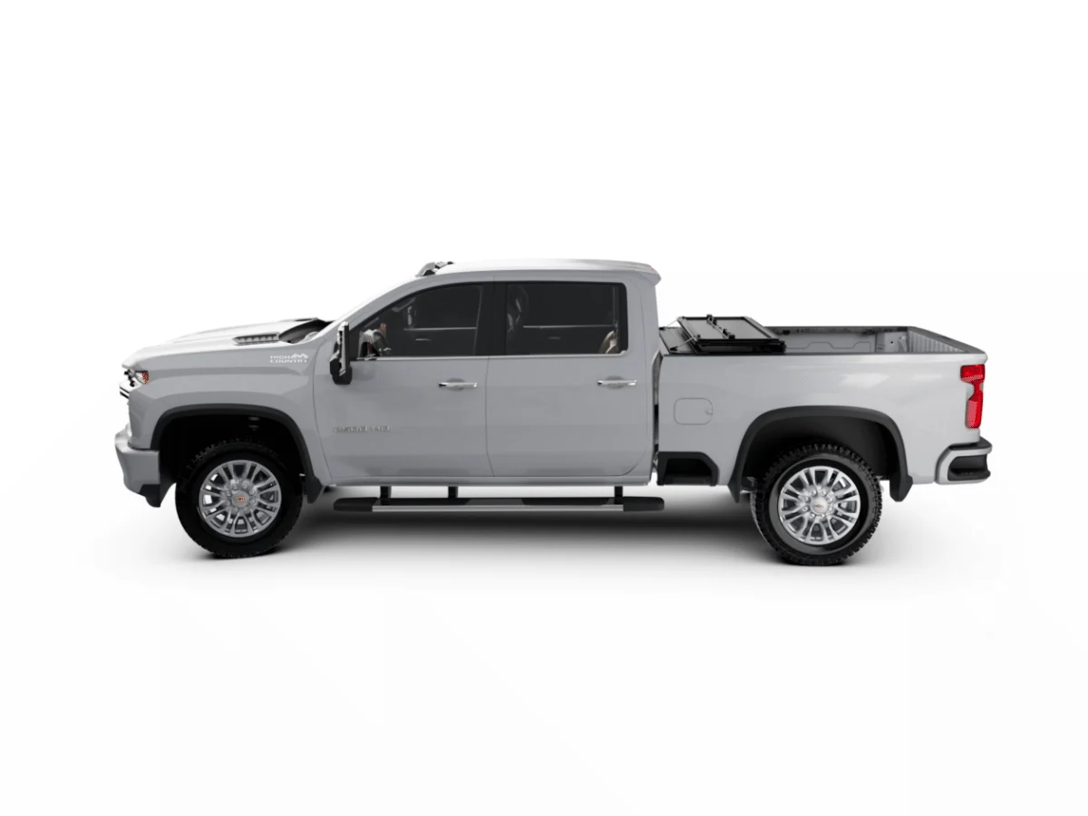 • Flip-up tri-fold design: One-hand cable latches allow quick bed access without cover removal.